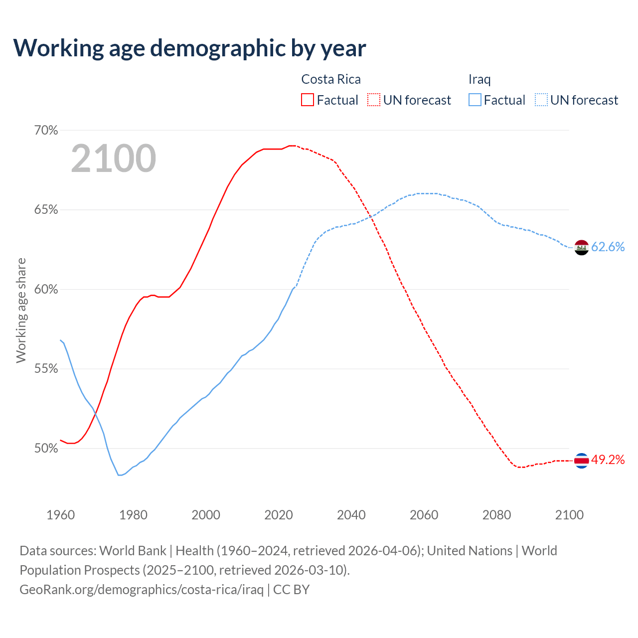 - Costa Rica has 3.57M working age adults (aged 15-64) vs 29M in Iraq.
