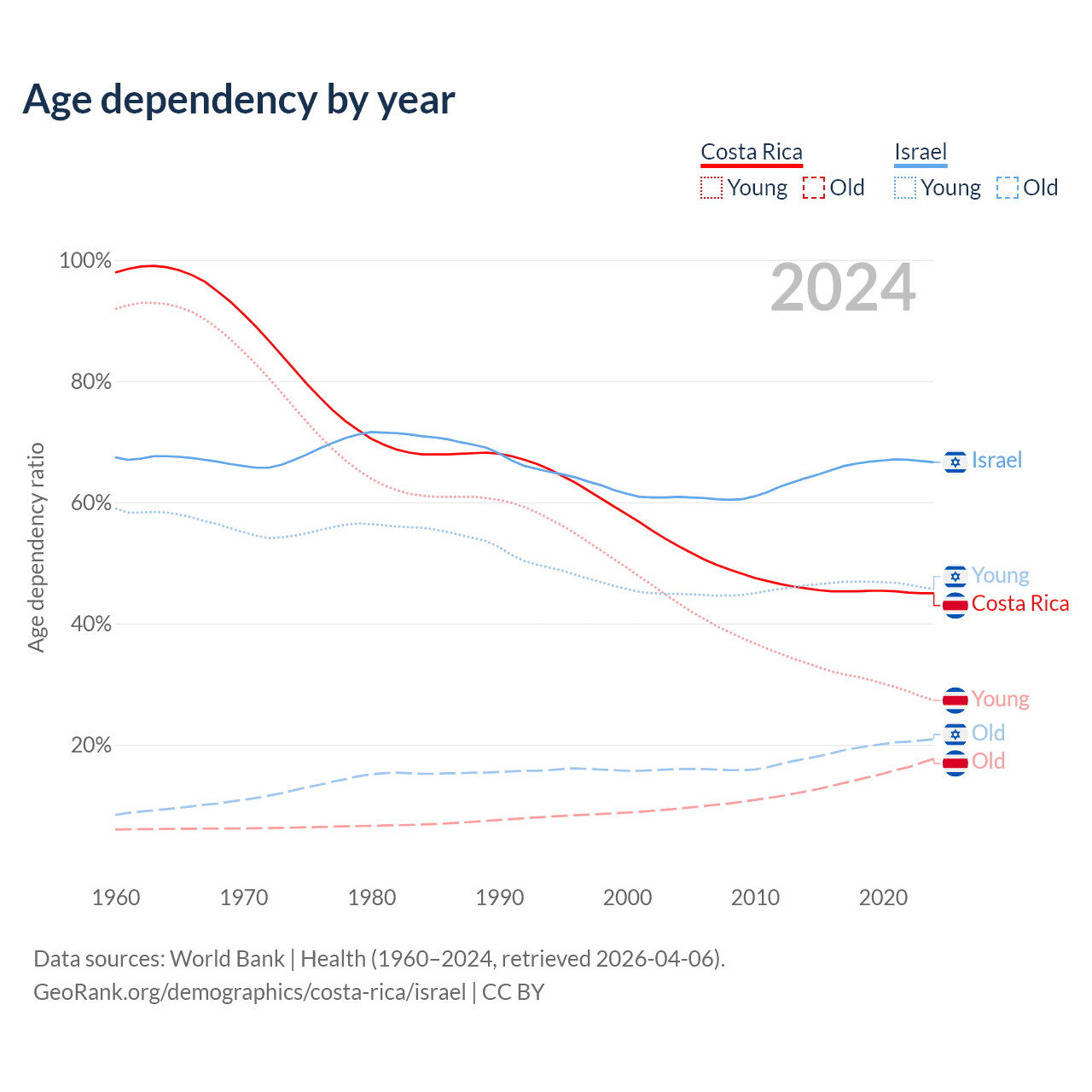 - Costa Rica is ranked 72/196 by median age (oldest to youngest) vs 103/196 for Israel.