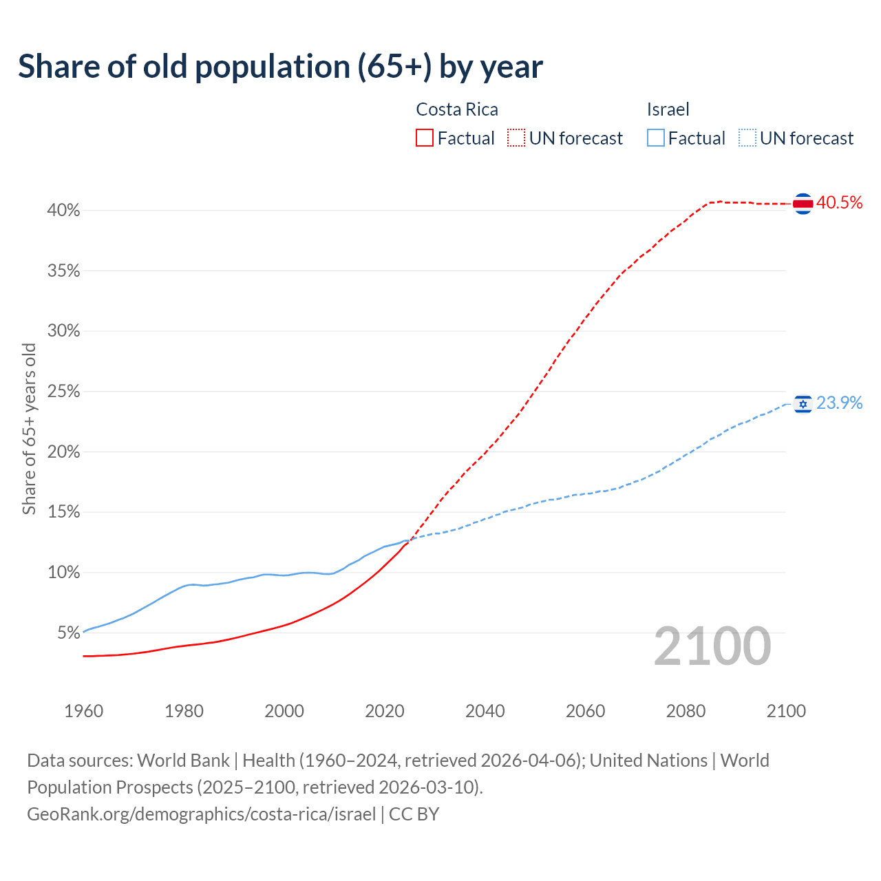The share of older people aged 65 and over is 12.2% in Costa Rica and 12.6% in Israel. Life expectancy in Costa Rica compared to Israel .