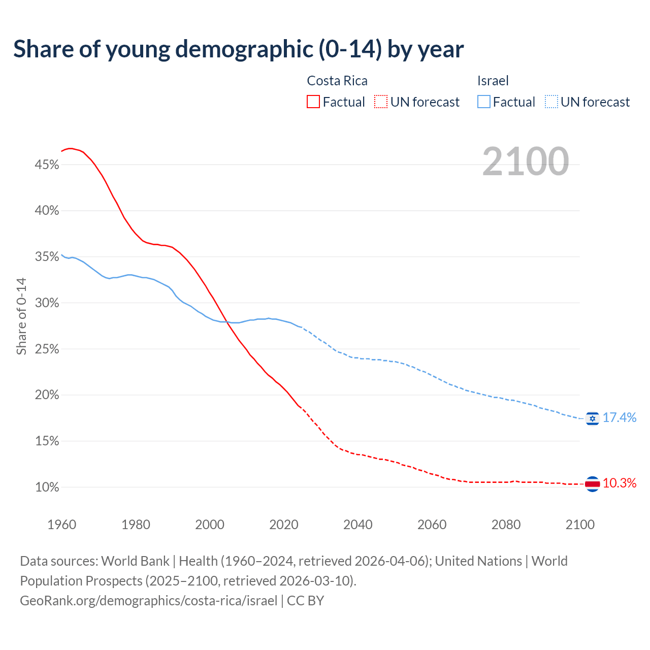 - The share of young demographic (0-15 years old) in Costa Rica is 18.8% vs 27.4% in Israel.