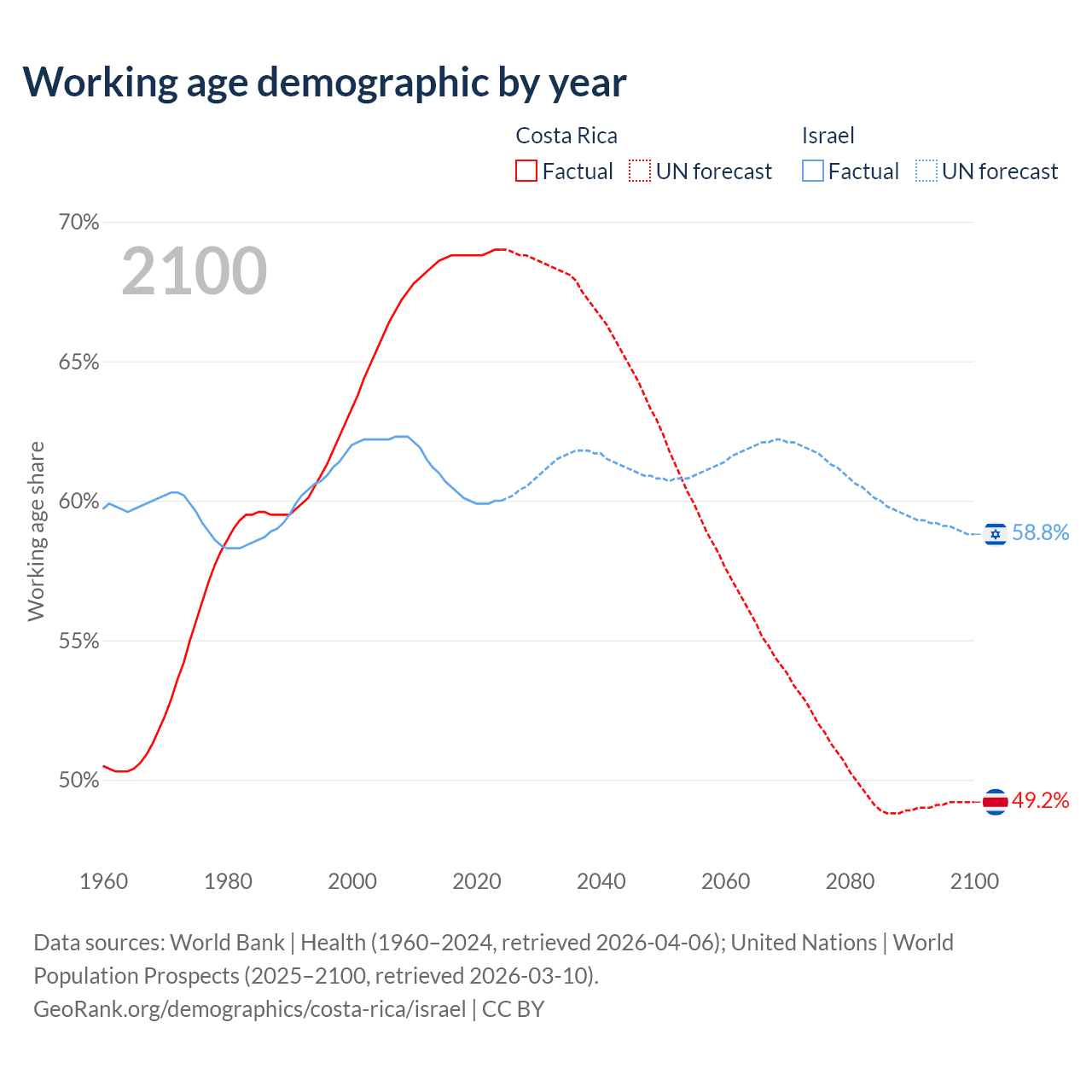 - Costa Rica has 3.57M working age adults (aged 15-64) vs 6.18M in Israel.