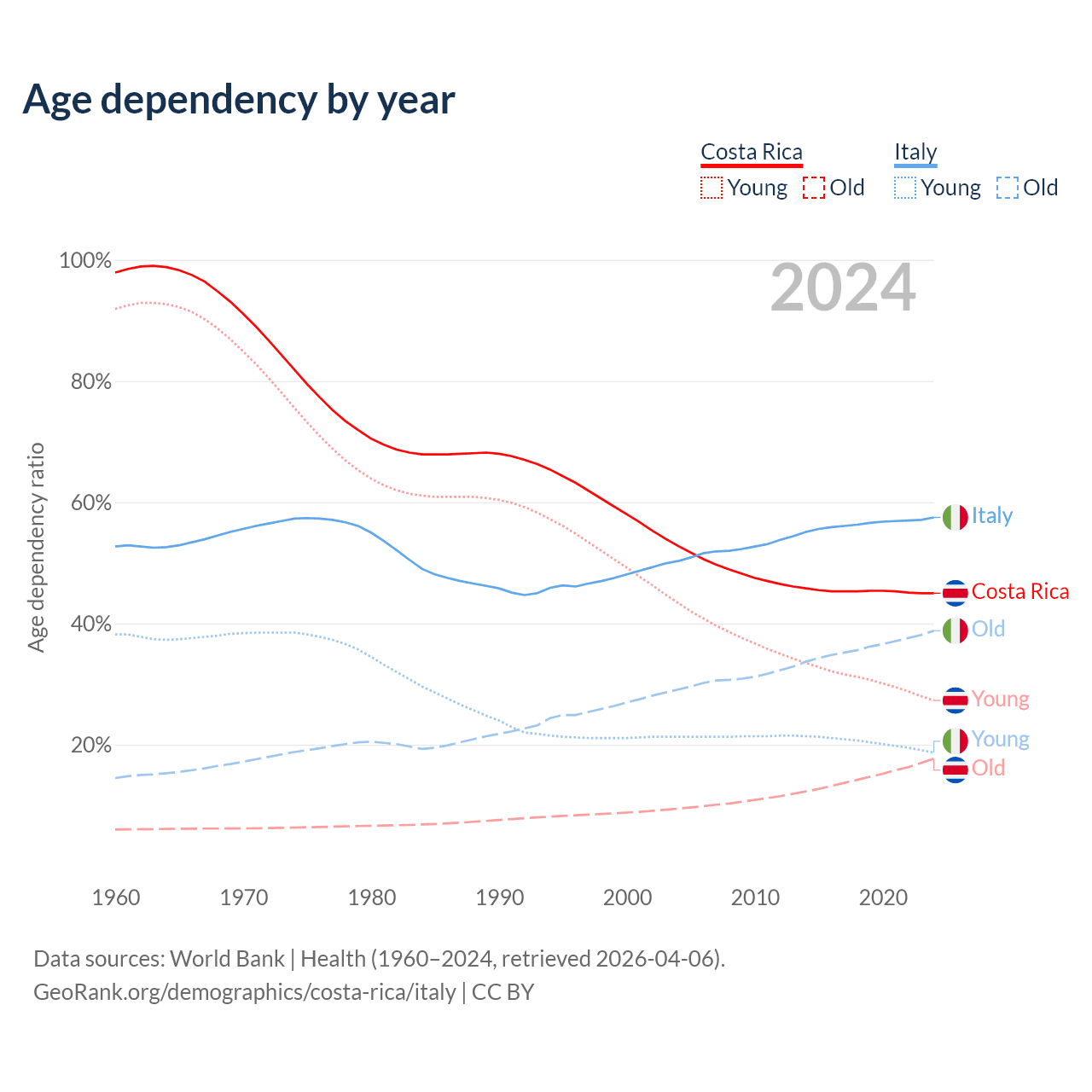 Data sources: World Bank | Health (1960–2024, retrieved 2026-04-06); U.S. Census Bureau (1960–2024, retrieved 2026-02-08).