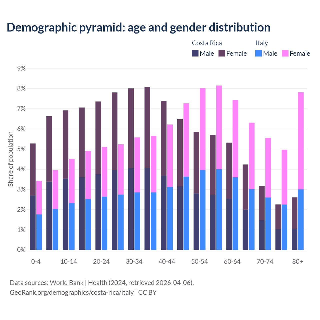 - Costa Rica is ranked 72/196 by median age (oldest to youngest) vs 4/196 for Italy.