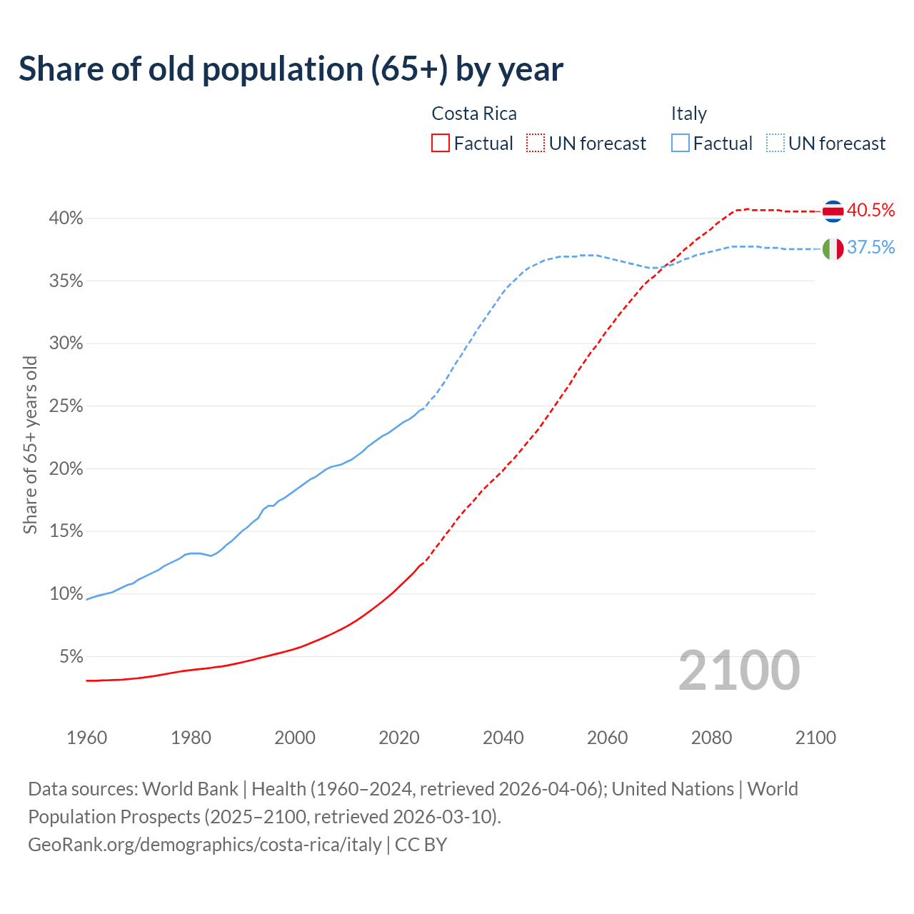 The share of older people aged 65 and over is 12.2% in Costa Rica and 24.6% in Italy. Life expectancy in Costa Rica compared to Italy .
