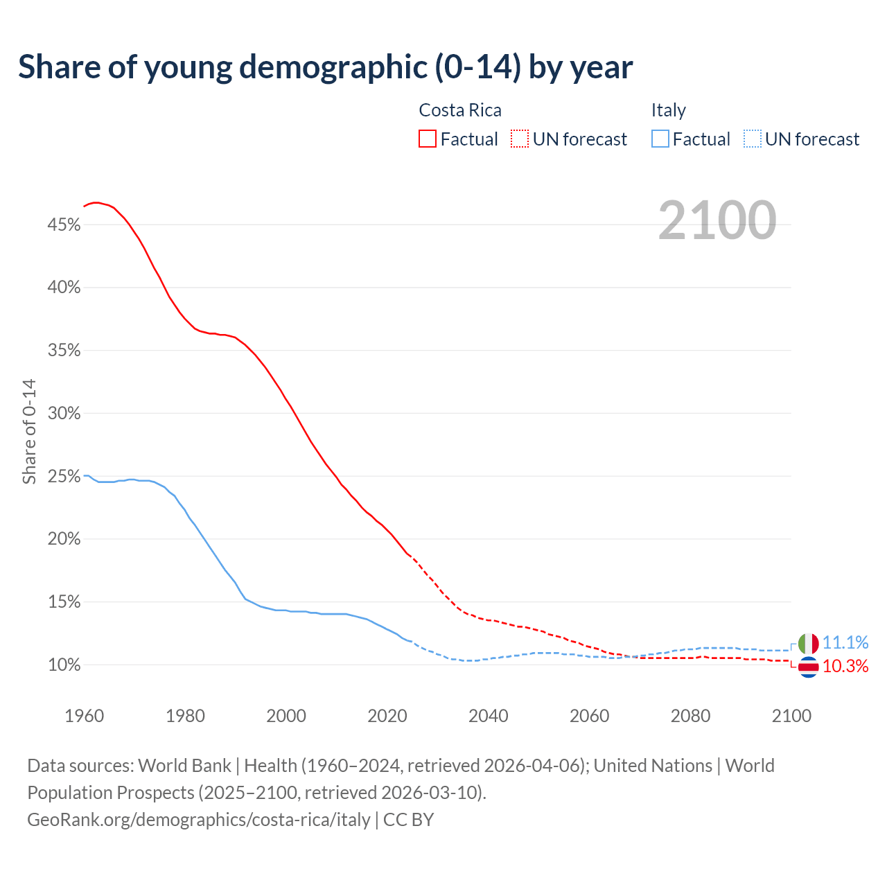 - The share of young demographic (0-15 years old) in Costa Rica is 18.8% vs 11.9% in Italy.