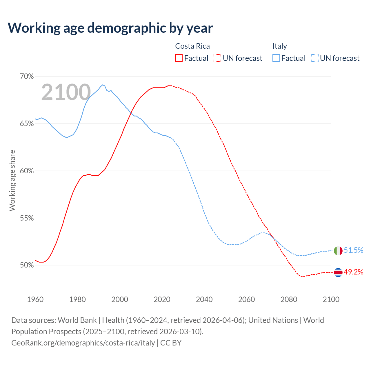 Median age Costa Rica vs Italy, 1960-2100