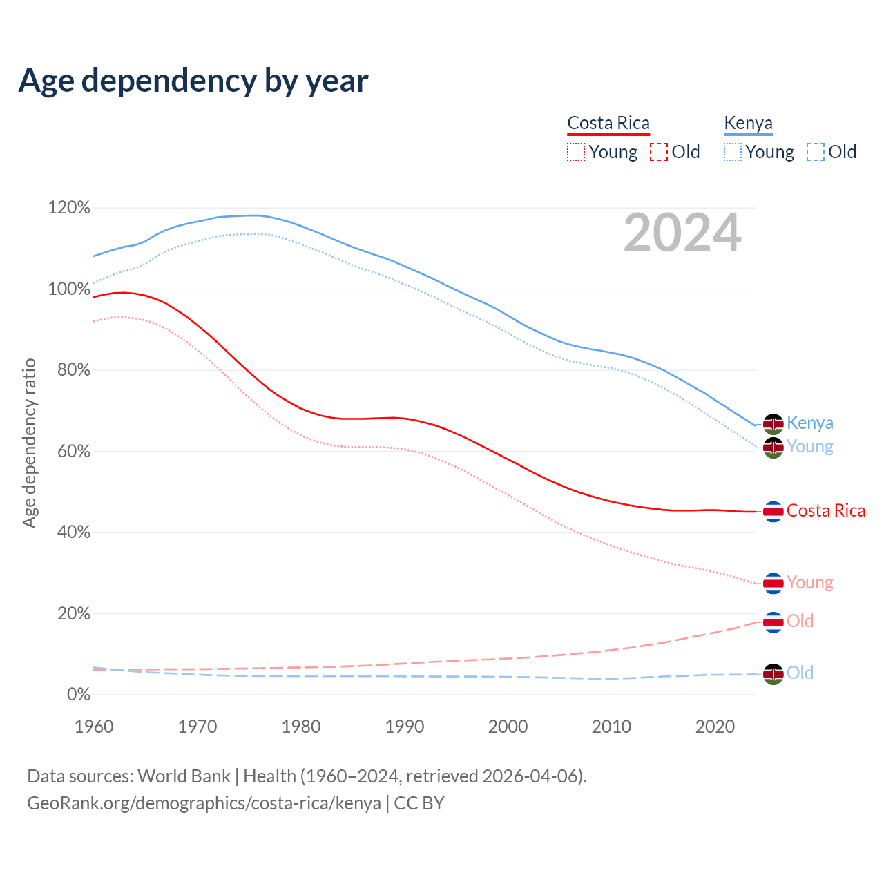 Data sources: World Bank | Health (1960–2024, retrieved 2026-04-06); U.S. Census Bureau (1960–2024, retrieved 2026-02-08).