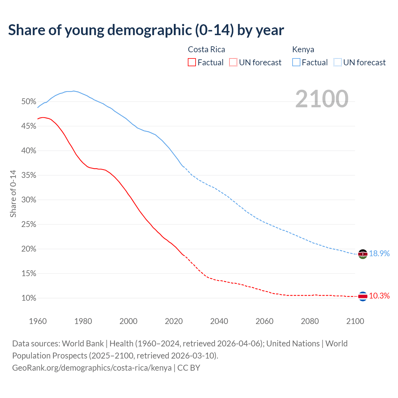 - The share of young demographic (0-15 years old) in Costa Rica is 18.8% vs 36.8% in Kenya.