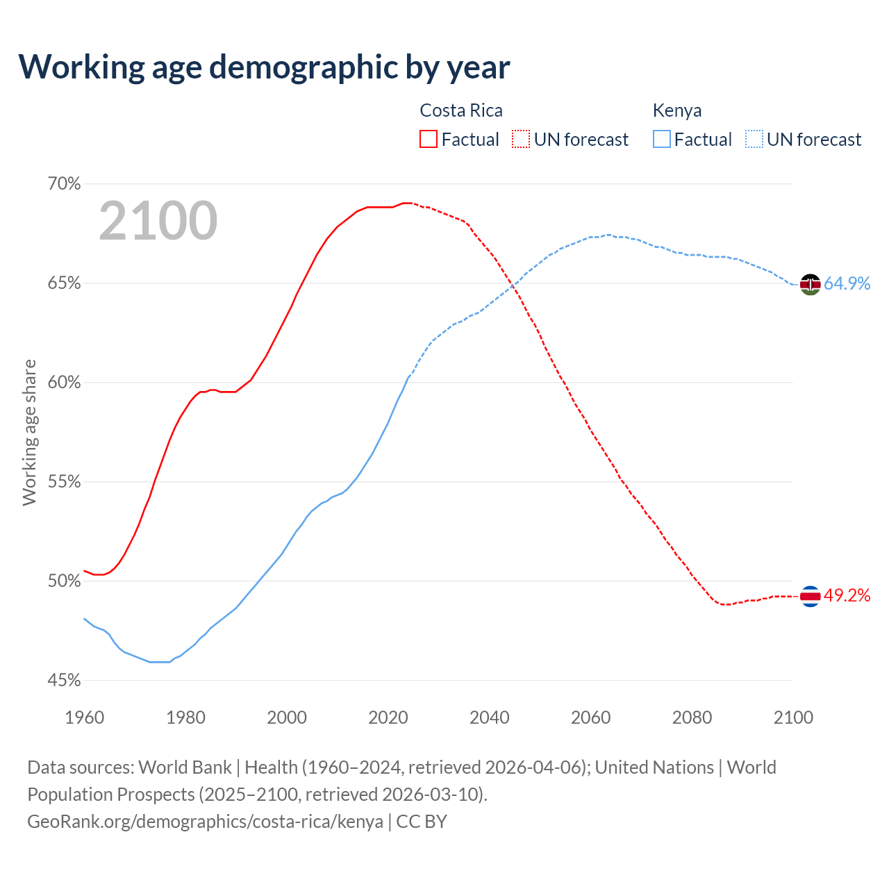 The share of older people aged 65 and over is 12.2% in Costa Rica and 2.97% in Kenya. Life expectancy in Costa Rica compared to Kenya .