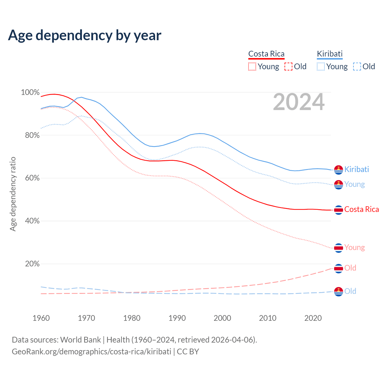 - The share of old-age demographic (65+) in Costa Rica is 12.2% vs 4.24% in Kiribati.