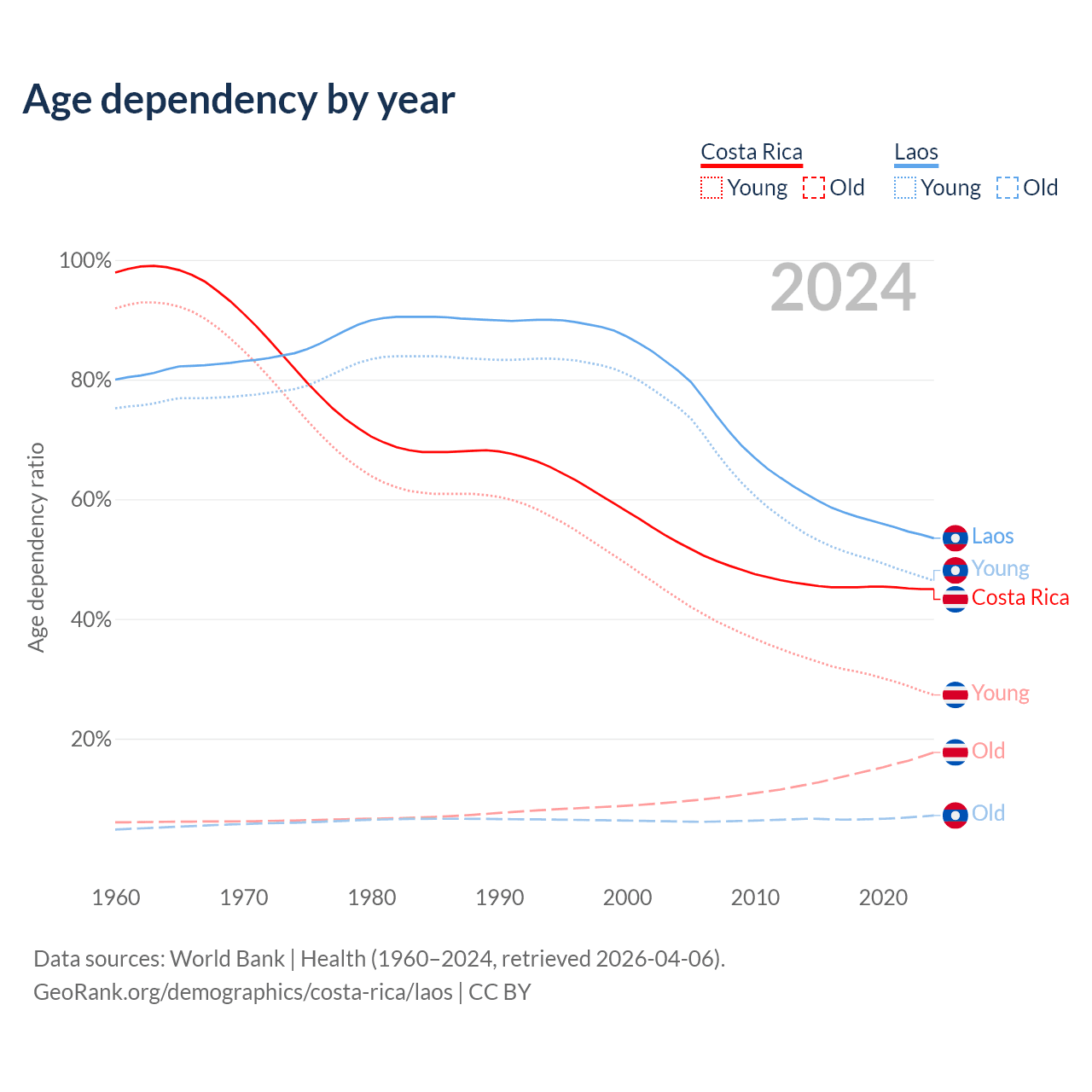 Data sources: World Bank | Health (1960–2024, retrieved 2026-04-06); U.S. Census Bureau (1960–2024, retrieved 2026-02-08).