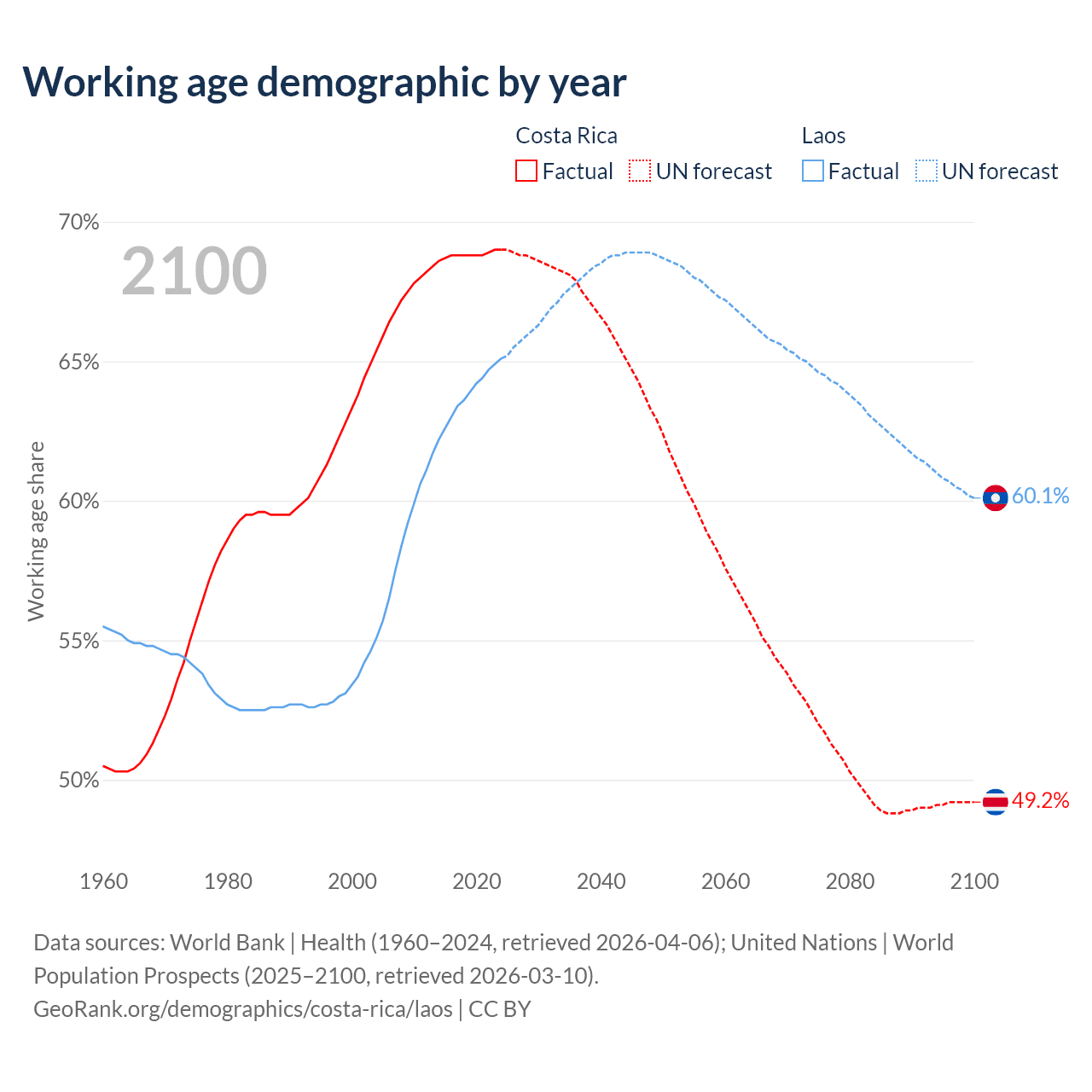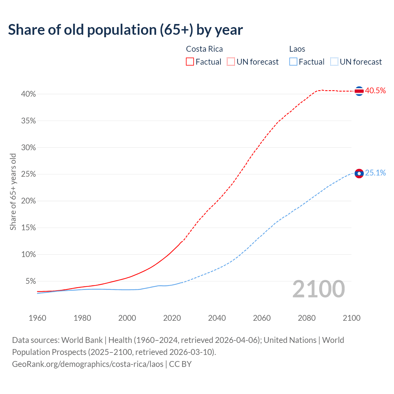 Median age Costa Rica vs Laos, 1960-2100