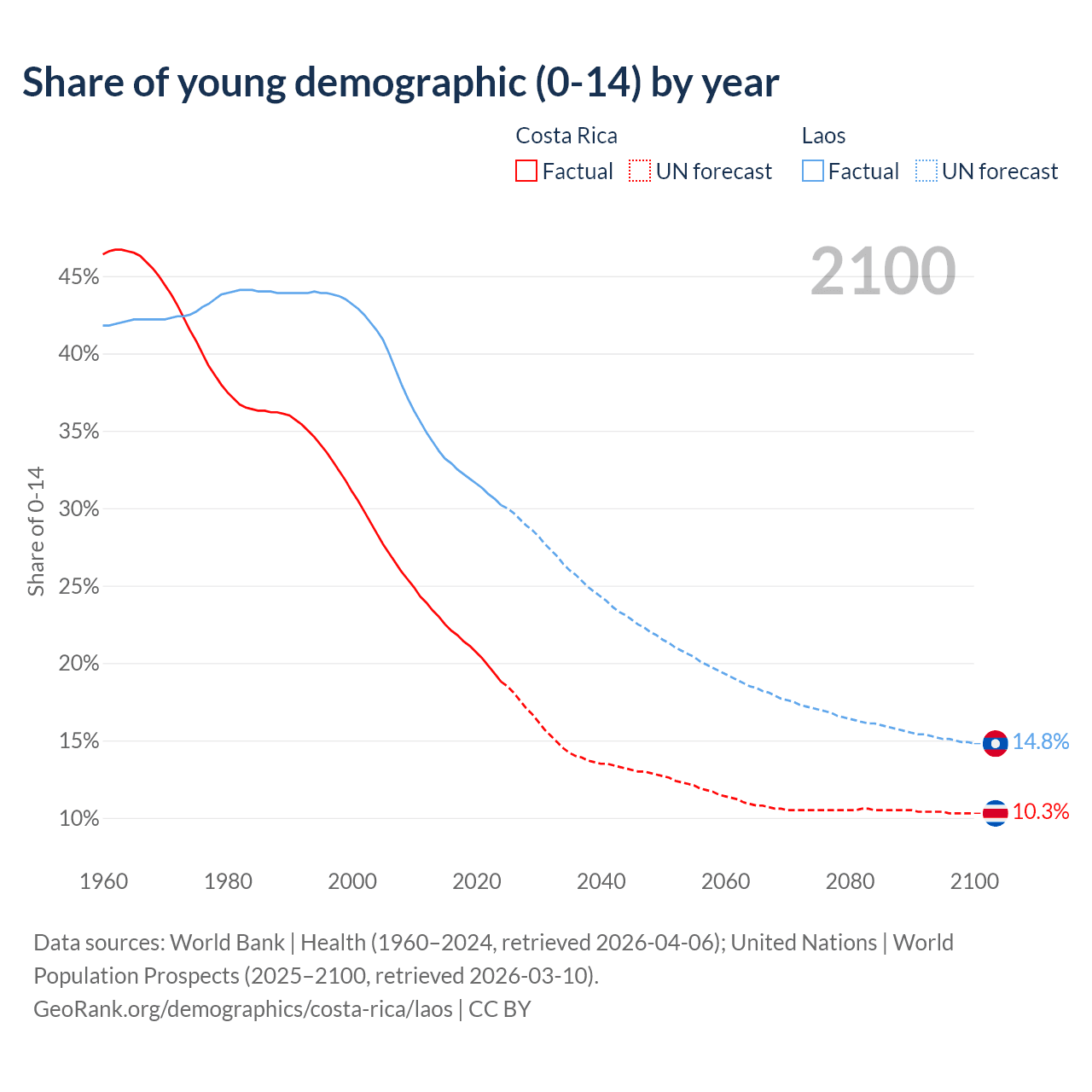 - The share of young demographic (0-15 years old) in Costa Rica is 18.8% vs 30.2% in Laos.