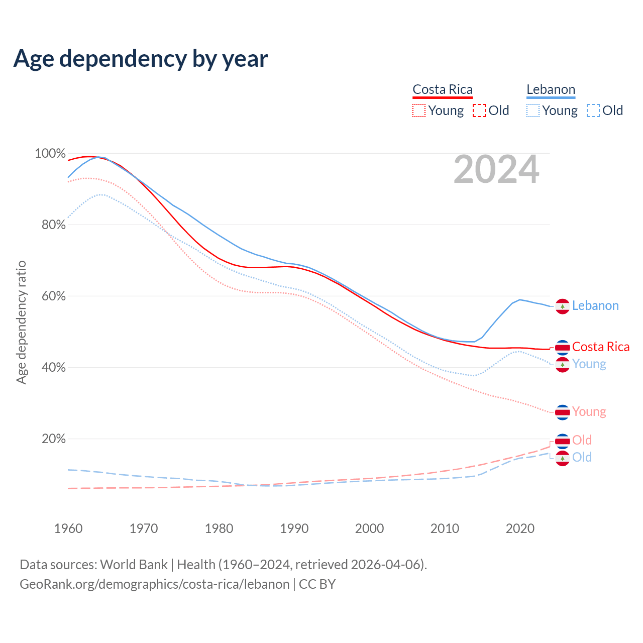Data sources: World Bank | Health (1960–2024, retrieved 2026-04-06); U.S. Census Bureau (1960–2024, retrieved 2026-02-08).