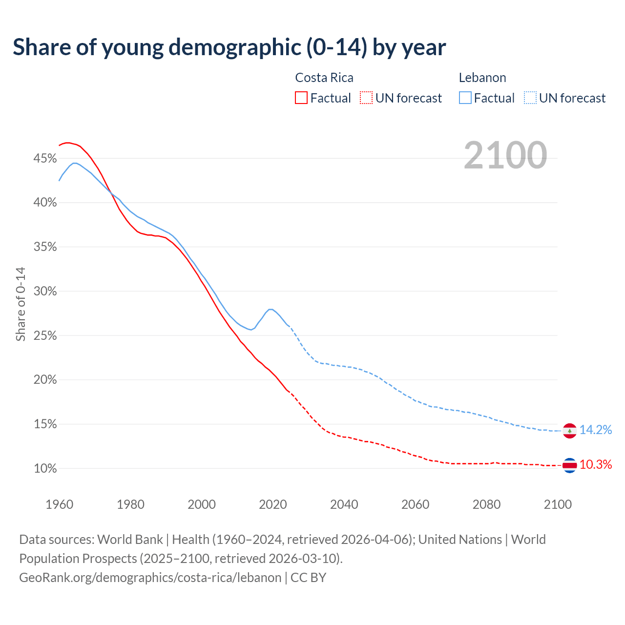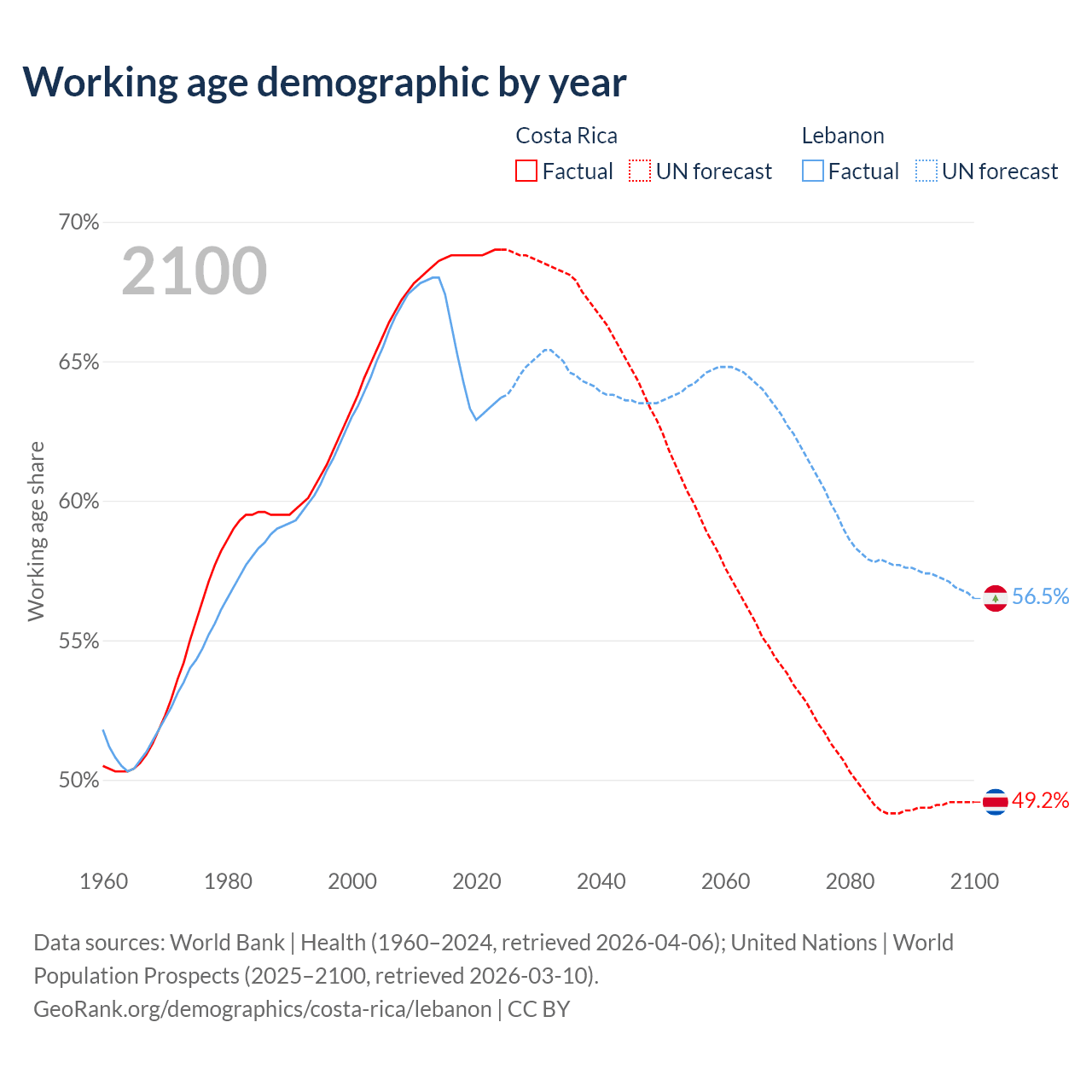 Median age Costa Rica vs Lebanon, 1960-2100