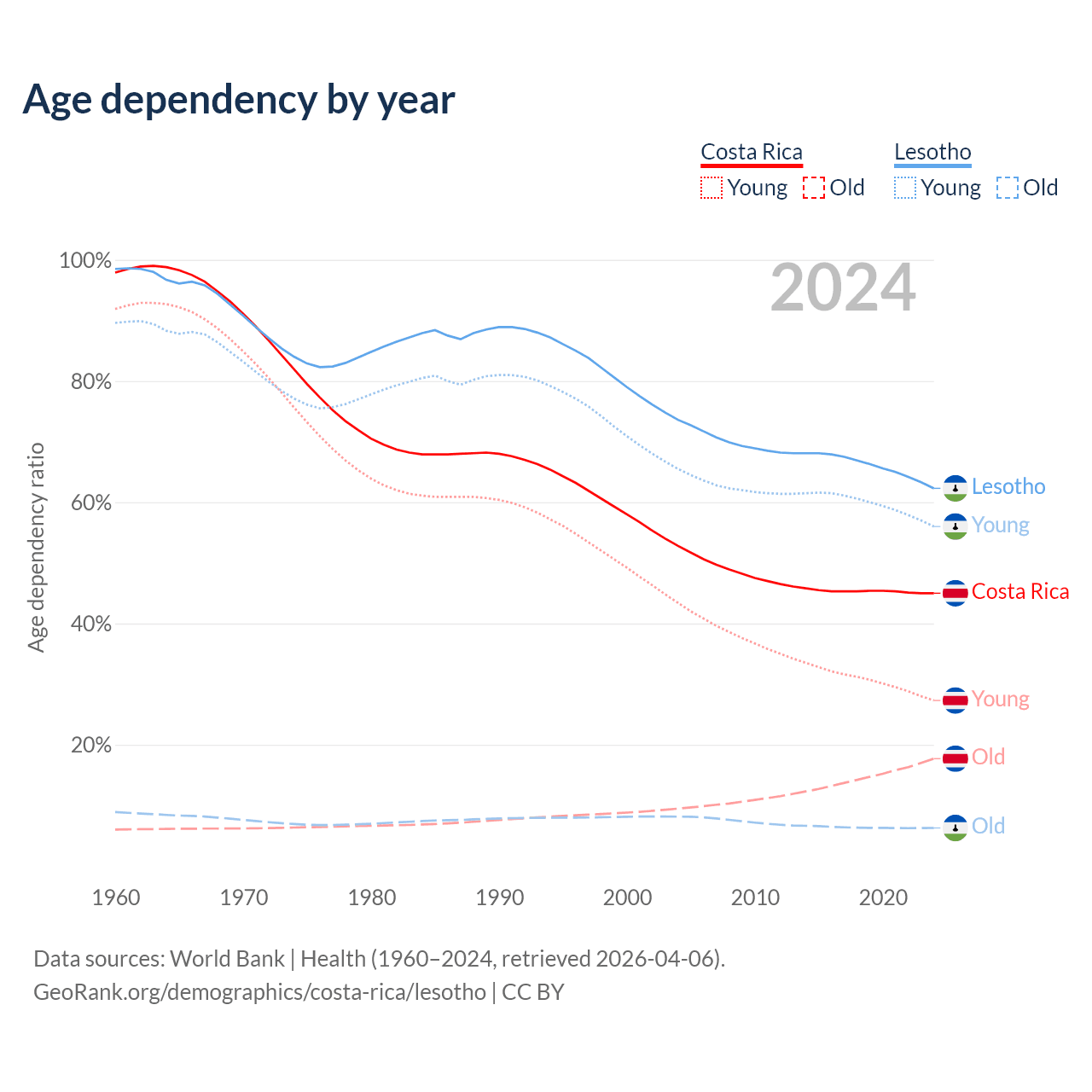 - Costa Rica is ranked 72/196 by median age (oldest to youngest) vs 143/196 for Lesotho.