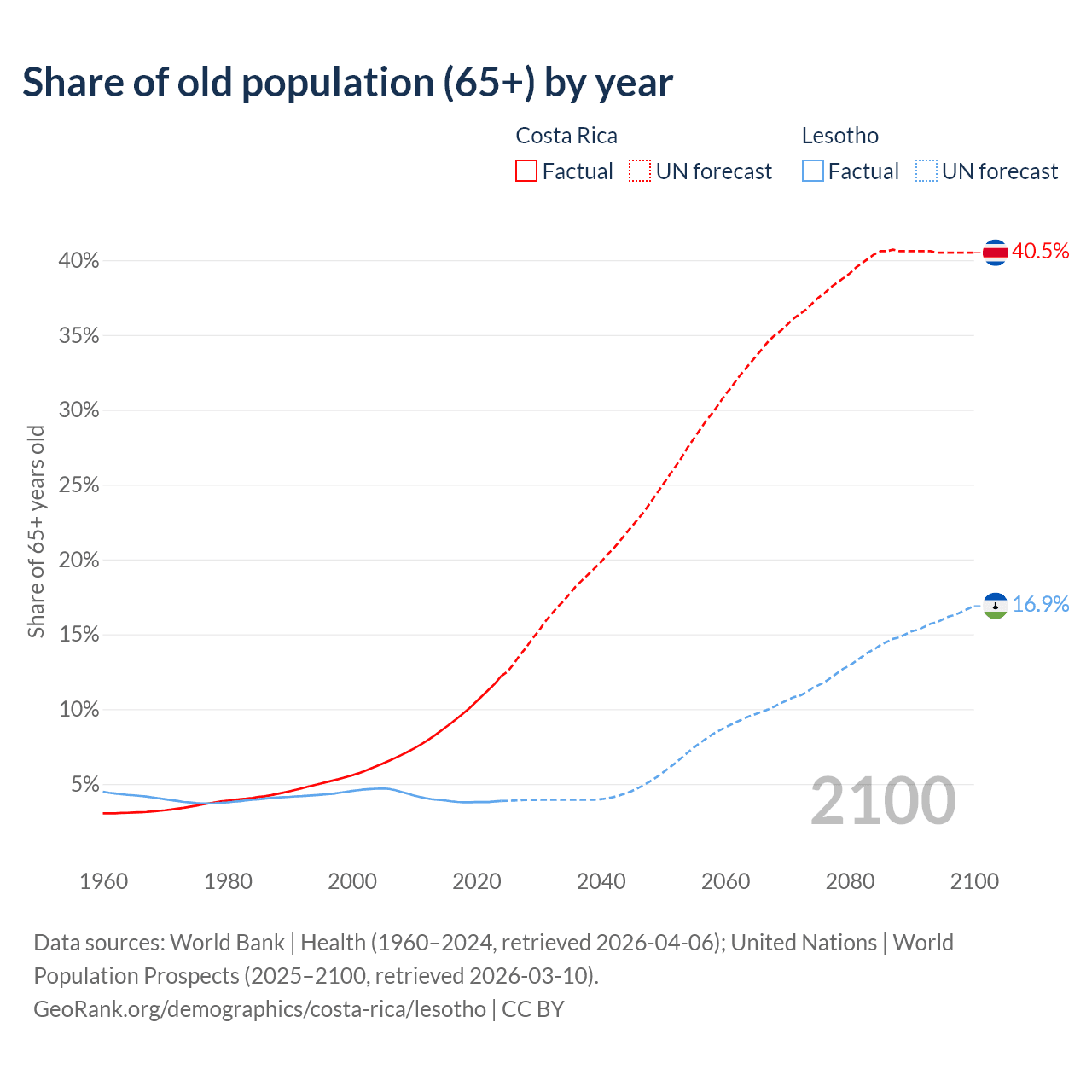 The share of older people aged 65 and over is 12.2% in Costa Rica and 3.86% in Lesotho. Life expectancy in Costa Rica compared to Lesotho .