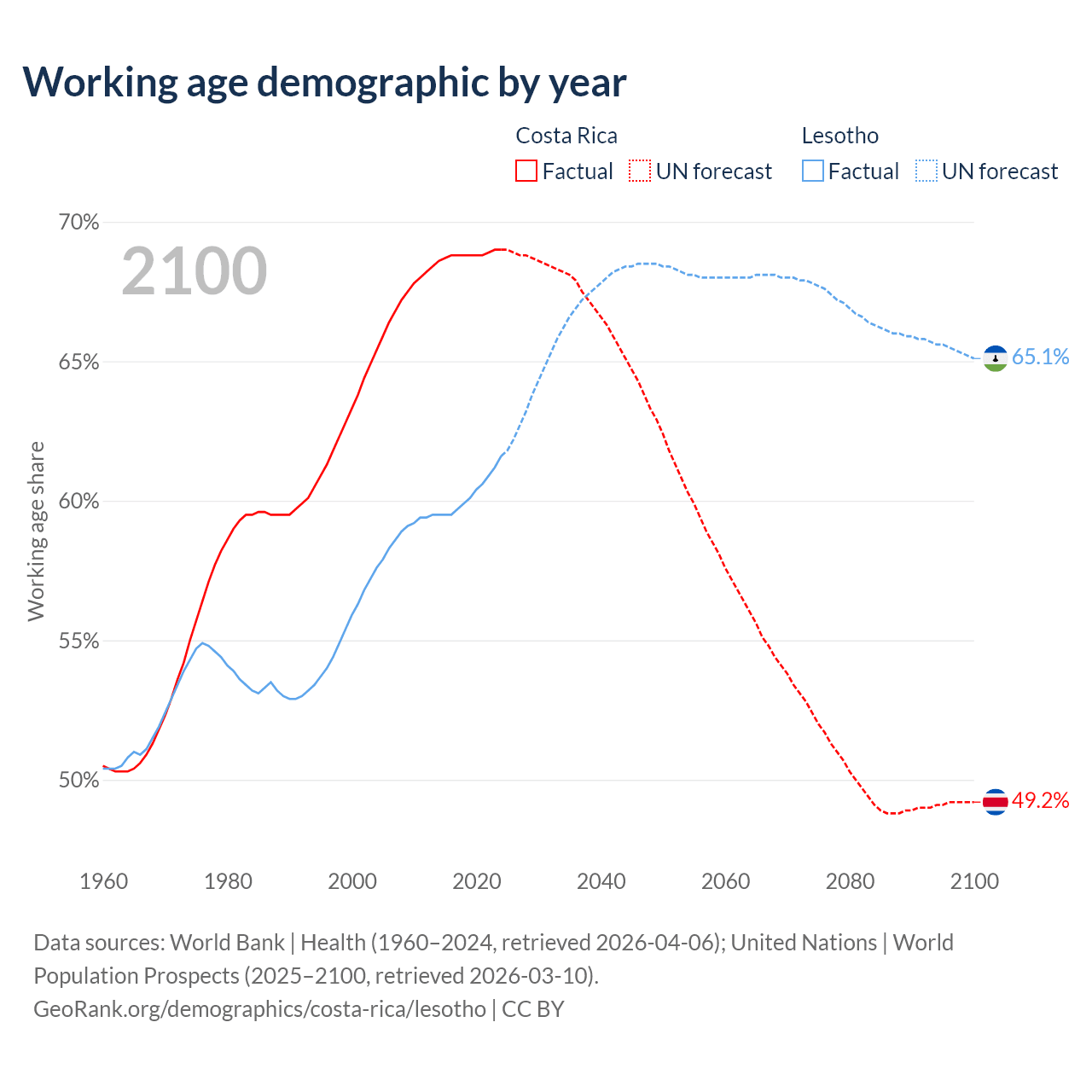 - Costa Rica has 3.57M working age adults (aged 15-64) vs 1.48M in Lesotho.