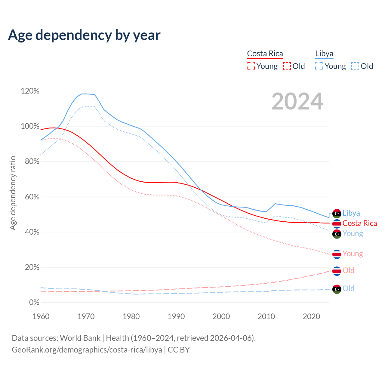 - Costa Rica is ranked 72/196 by median age (oldest to youngest) vs 114/196 for Libya.