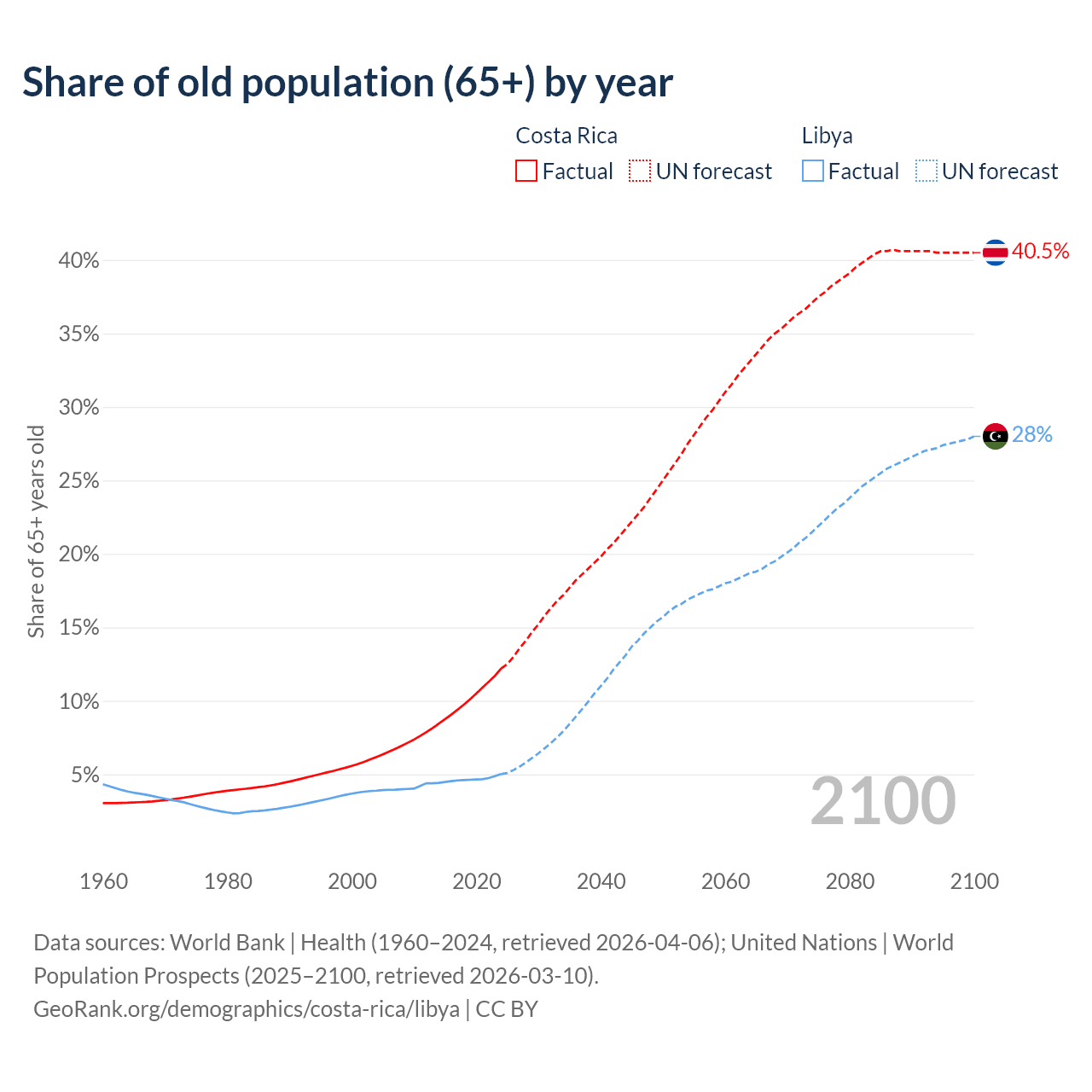 The share of older people aged 65 and over is 12.2% in Costa Rica and 5.02% in Libya. Life expectancy in Costa Rica compared to Libya .