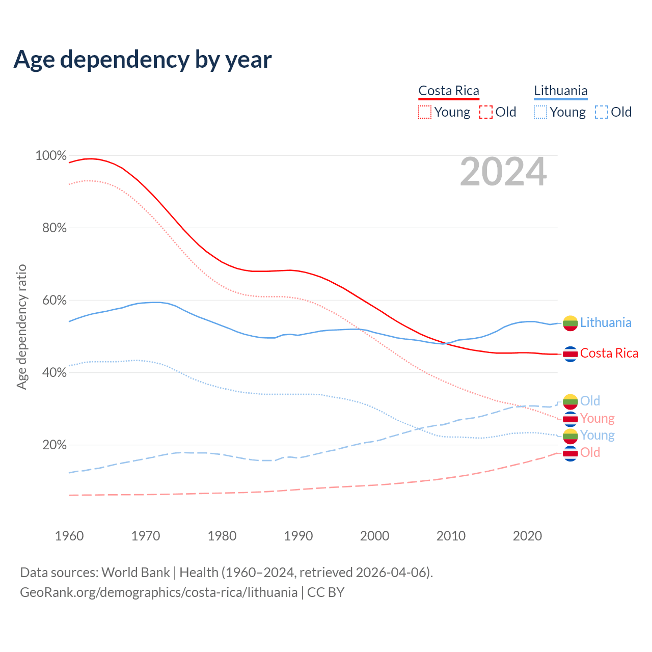 - Costa Rica is ranked 72/196 by median age (oldest to youngest) vs 28/196 for Lithuania.