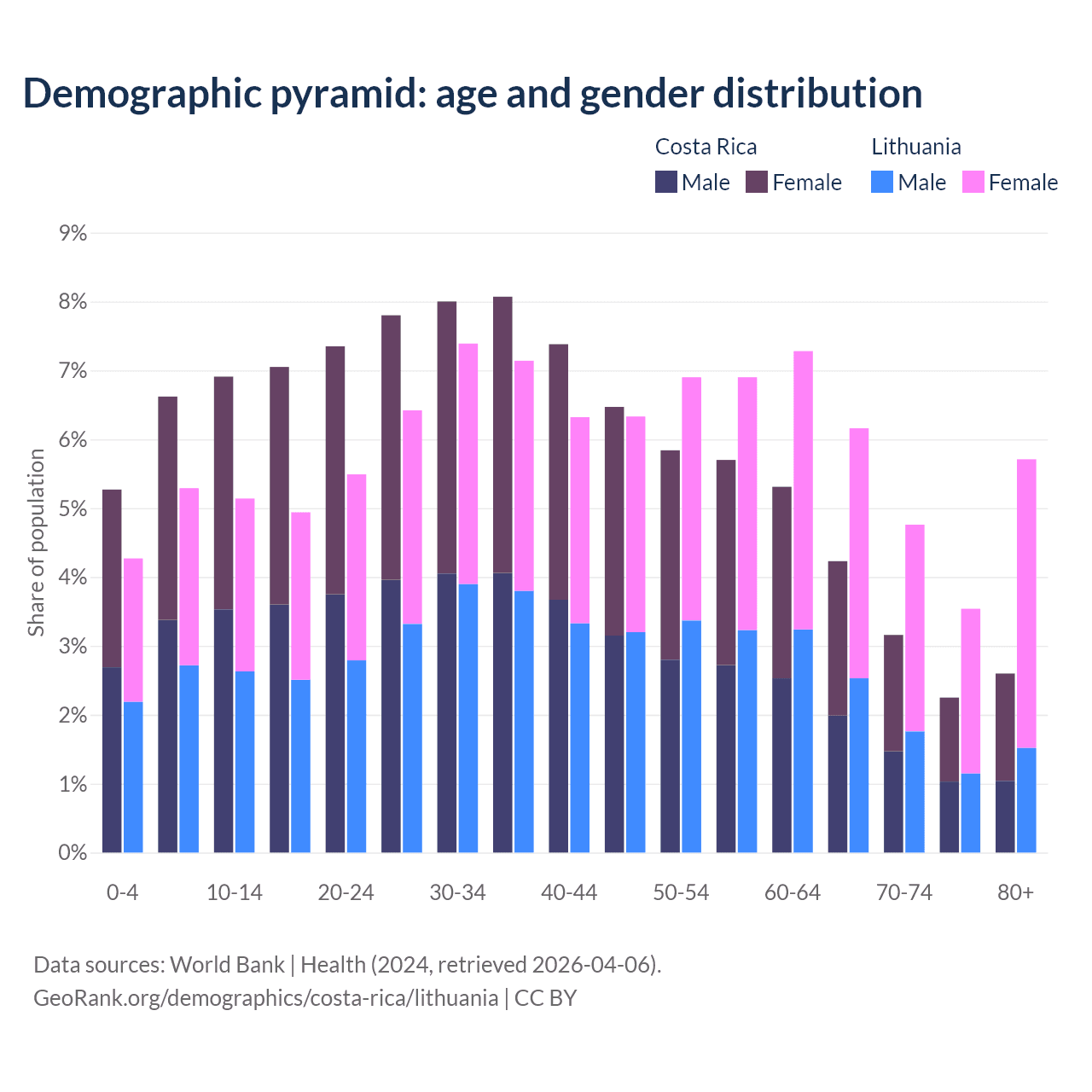 The share of older people aged 65 and over is 12.2% in Costa Rica and 20.2% in Lithuania. Life expectancy in Costa Rica compared to Lithuania .