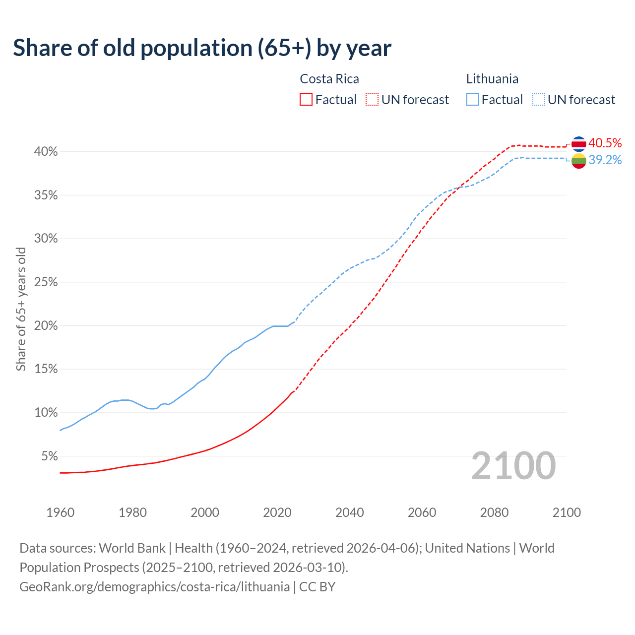 Median age Costa Rica vs Lithuania, 1960-2100