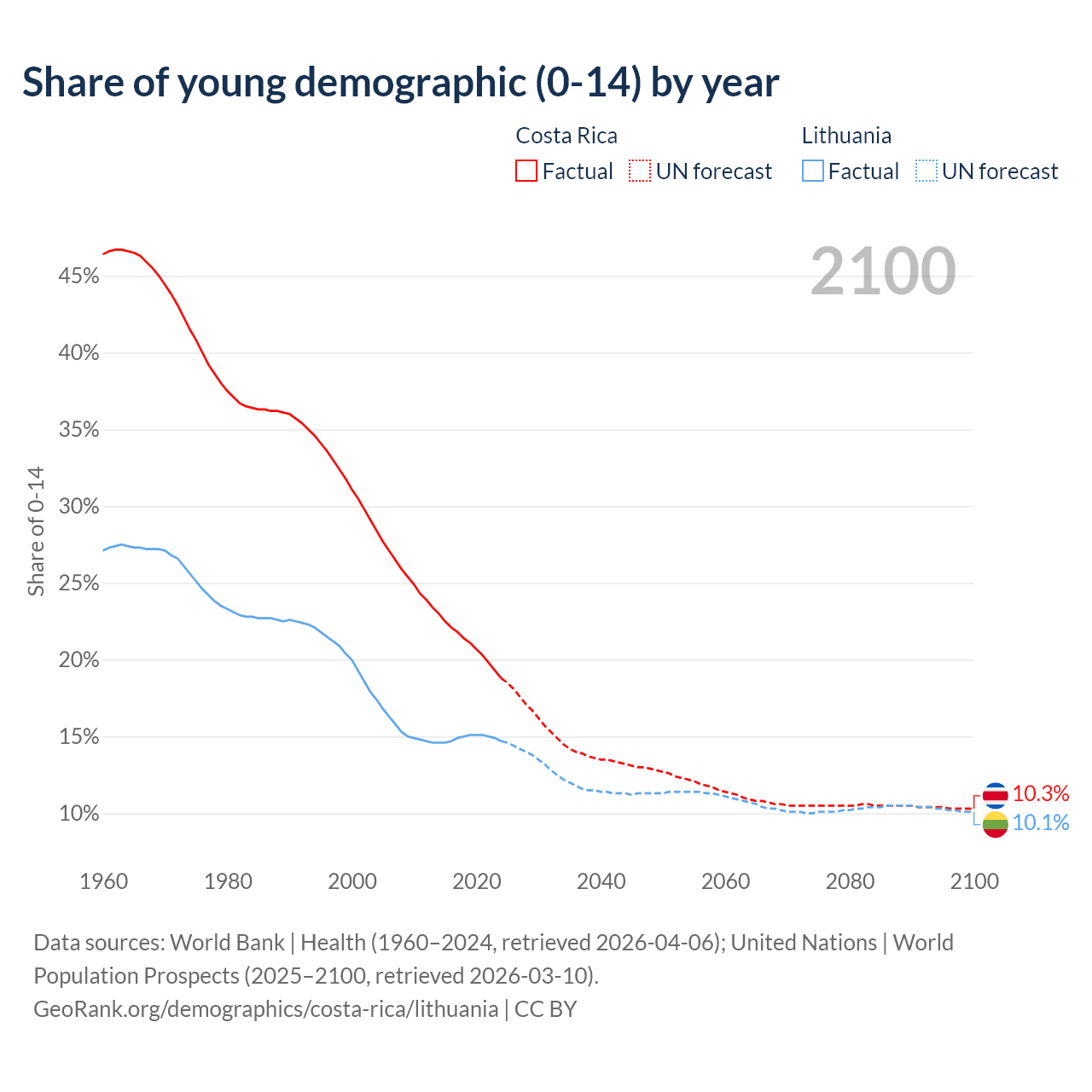 - The share of young demographic (0-15 years old) in Costa Rica is 18.8% vs 14.7% in Lithuania.