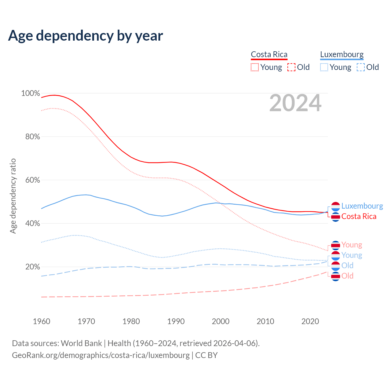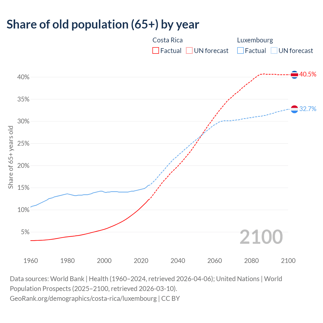 The share of older people aged 65 and over is 12.2% in Costa Rica and 15.5% in Luxembourg. Life expectancy in Costa Rica compared to Luxembourg .