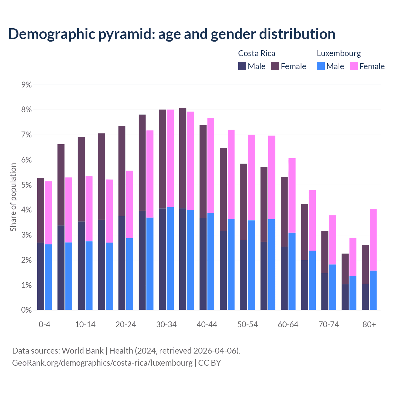 - Costa Rica is ranked 72/196 by median age (oldest to youngest) vs 46/196 for Luxembourg.