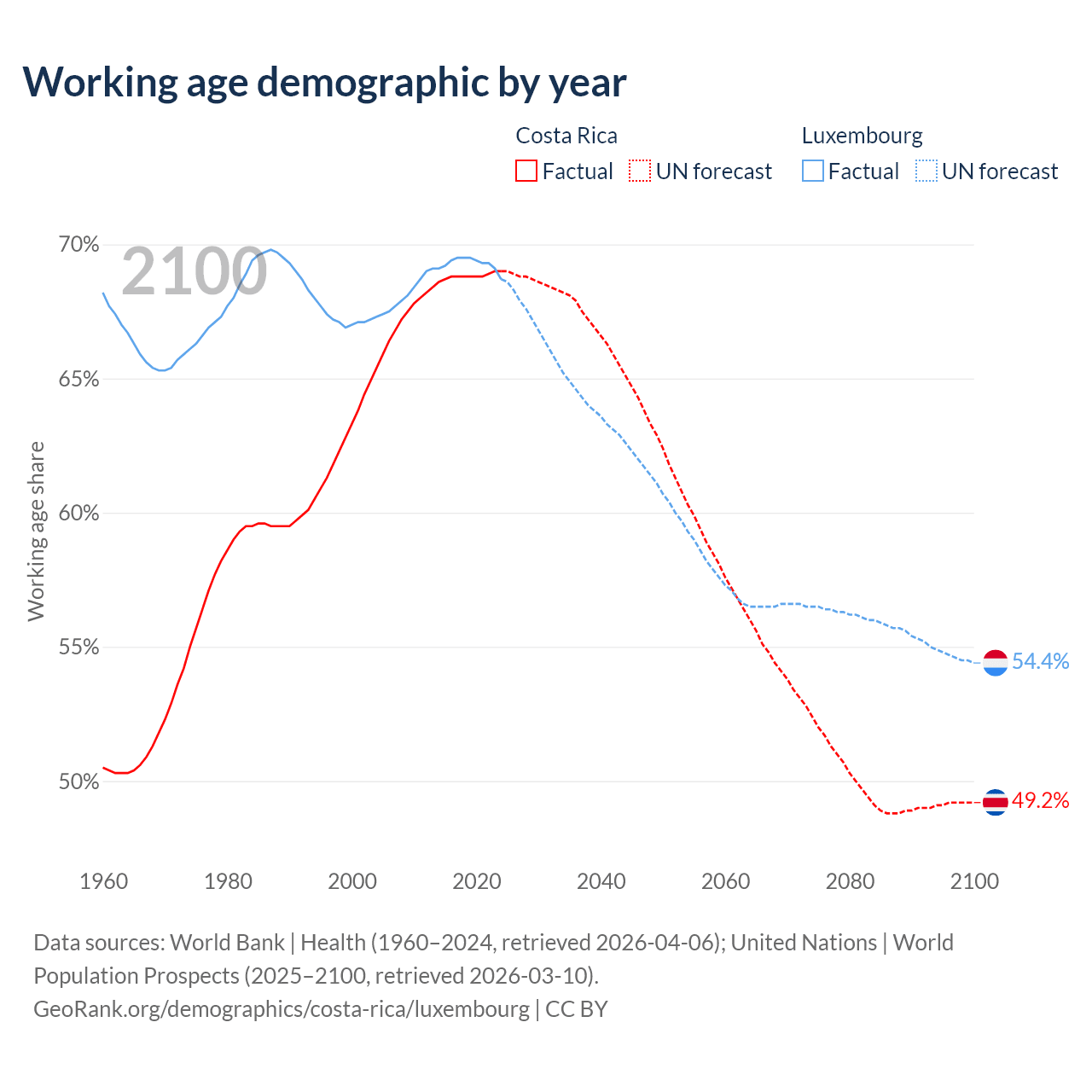 - Costa Rica has 3.57M working age adults (aged 15-64) vs 477K in Luxembourg.