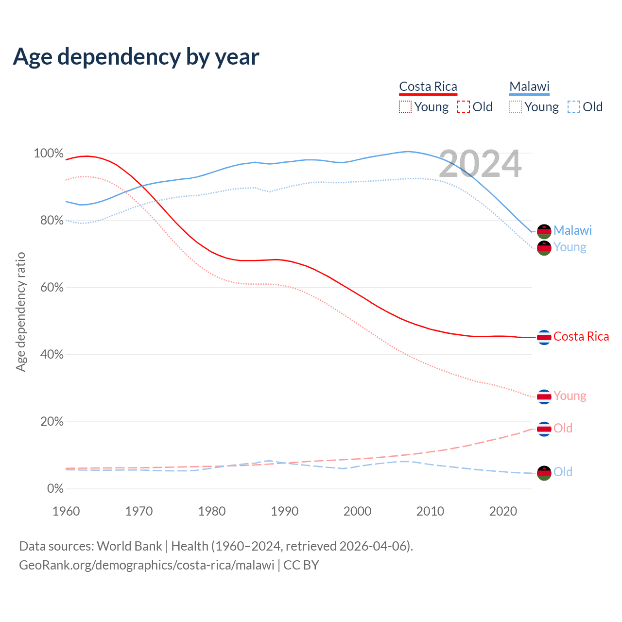 - The share of old-age demographic (65+) in Costa Rica is 12.2% vs 2.59% in Malawi.