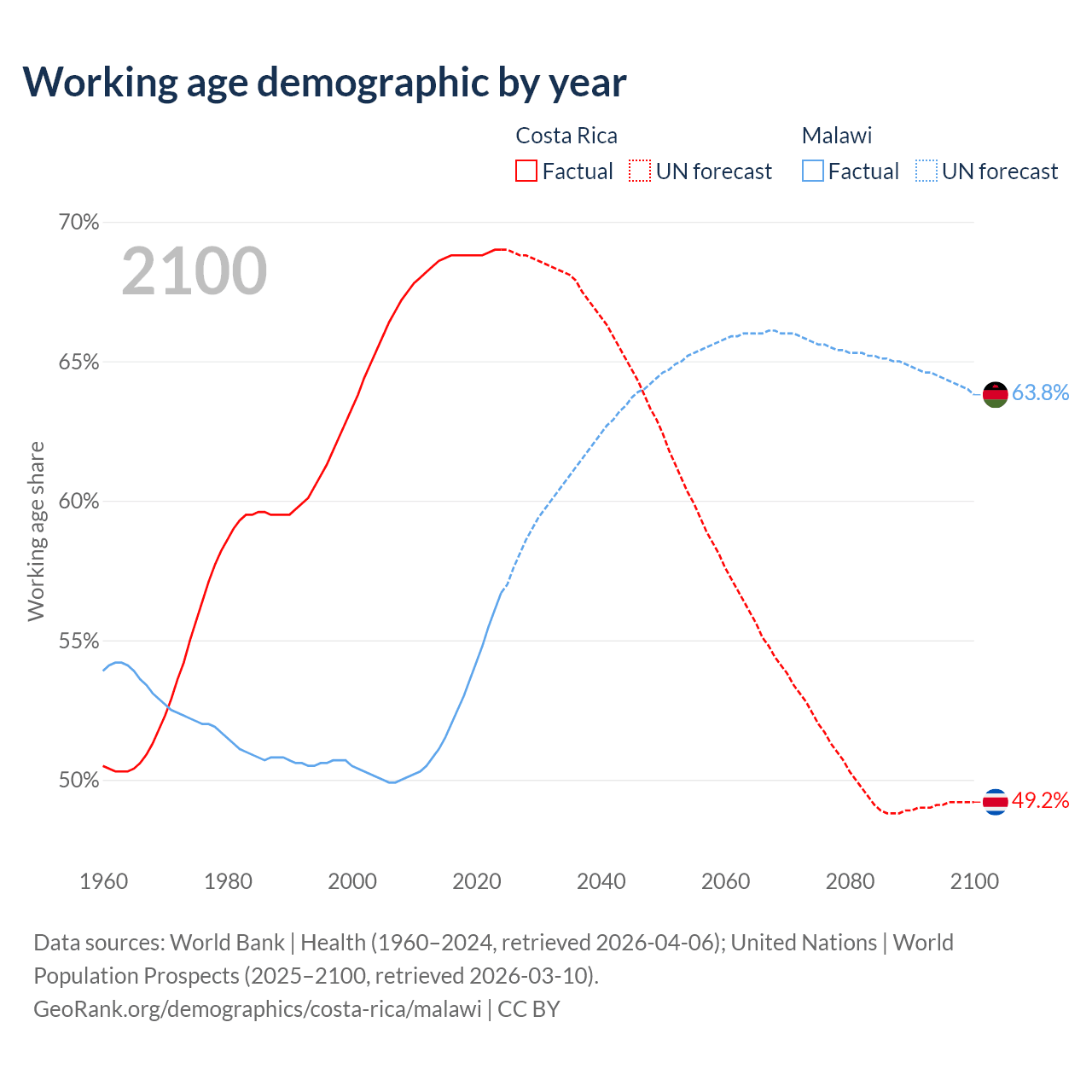 Median age Costa Rica vs Malawi, 1960-2100