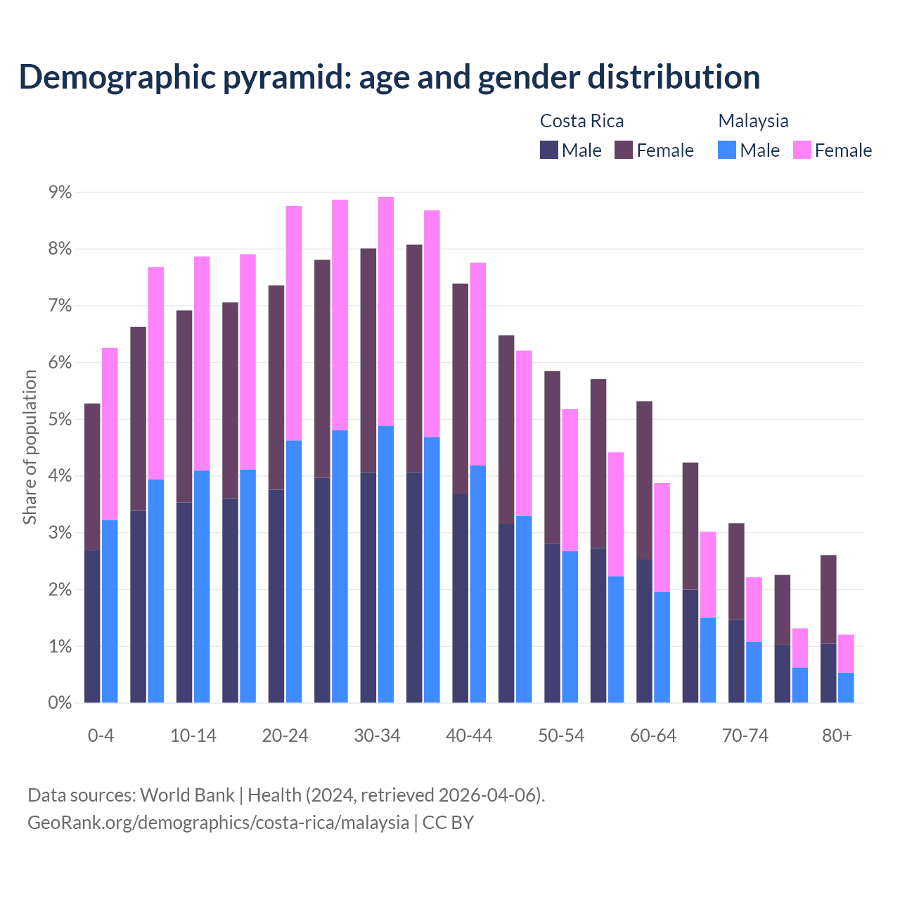 - Costa Rica is ranked 72/196 by median age (oldest to youngest) vs 92/196 for Malaysia.
