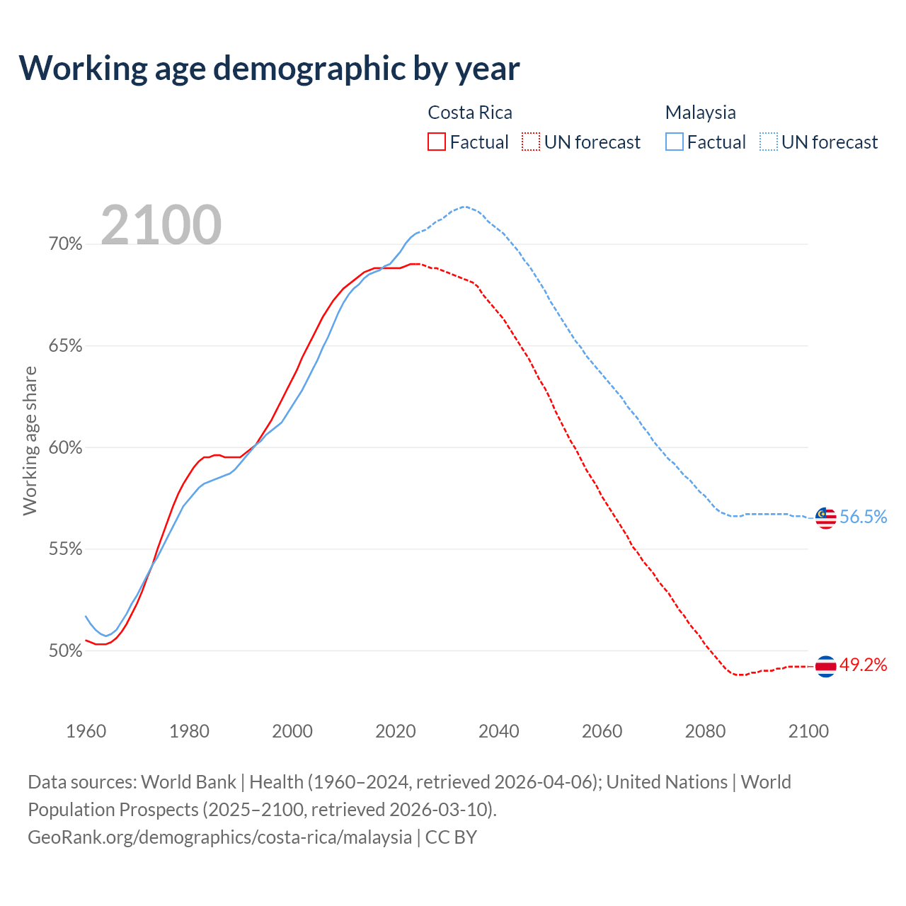 Median age Costa Rica vs Malaysia, 1960-2100