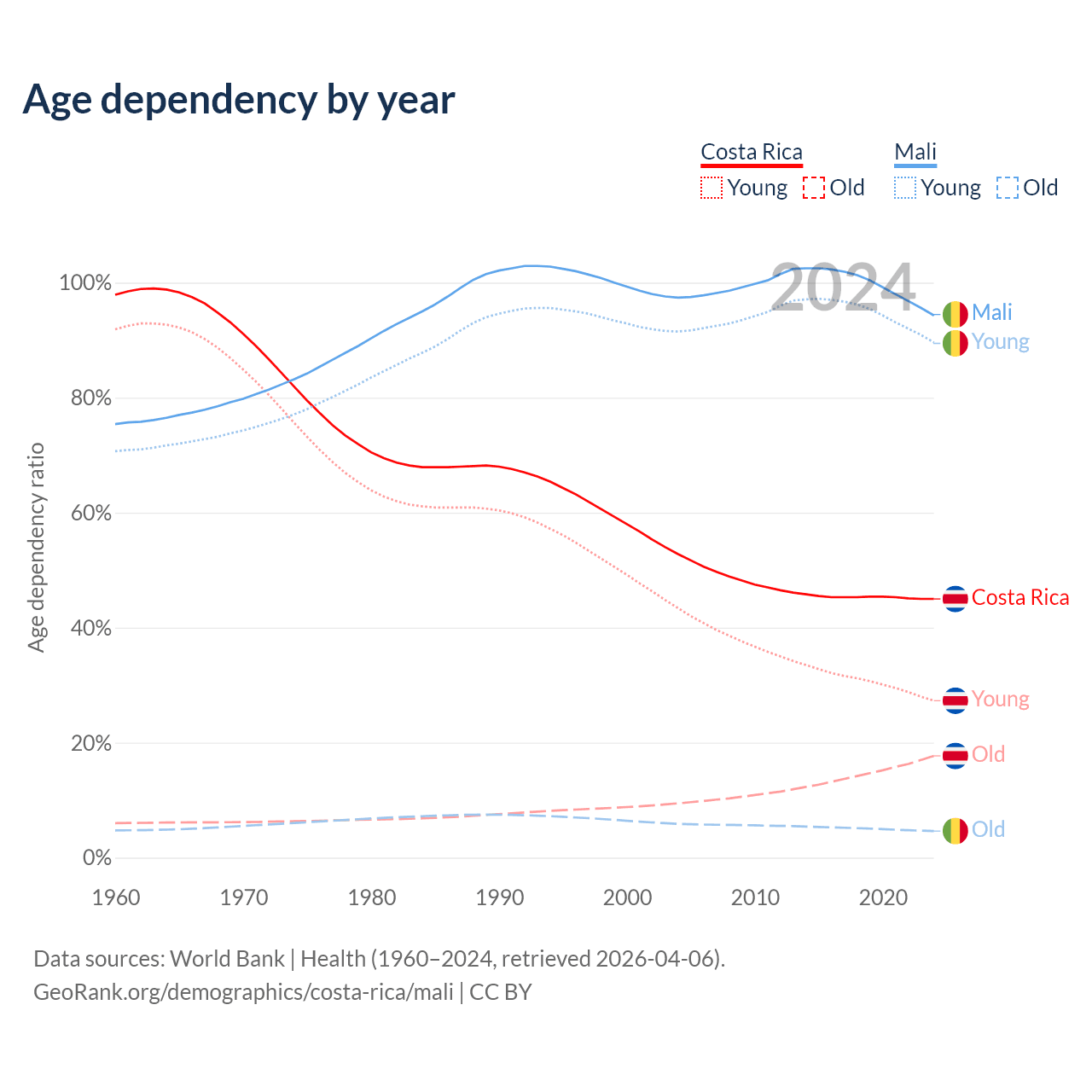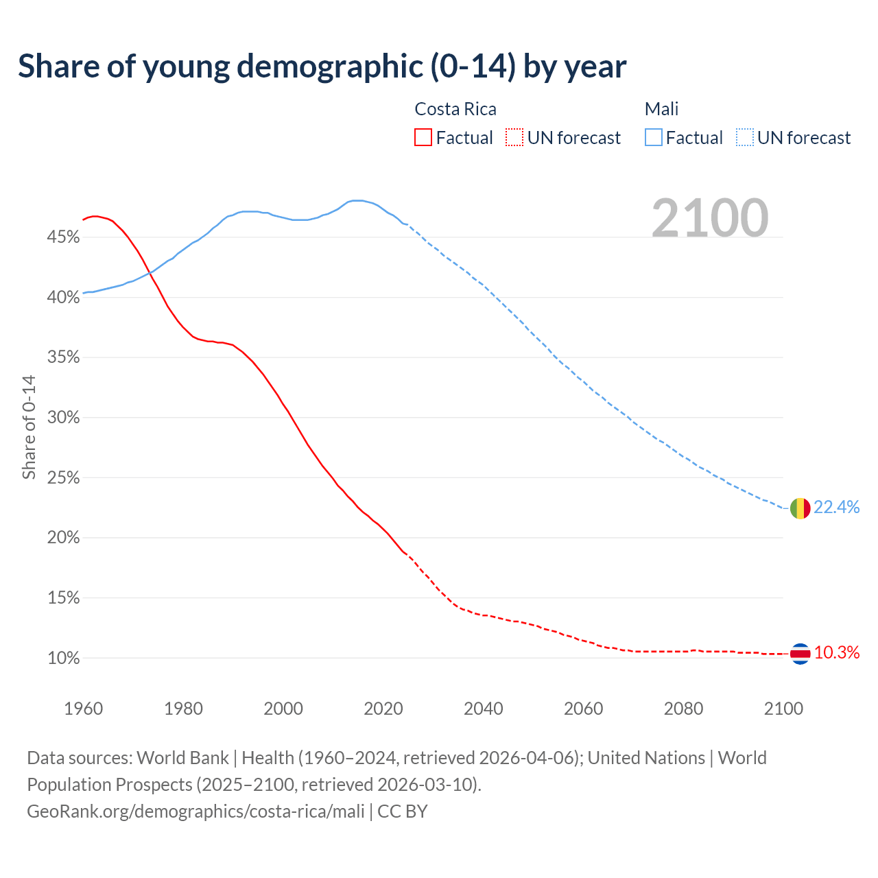 - The share of young demographic (0-15 years old) in Costa Rica is 18.8% vs 46.1% in Mali.