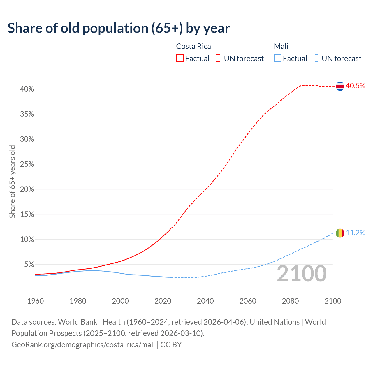 - The share of old-age demographic (65+) in Costa Rica is 12.2% vs 2.38% in Mali.