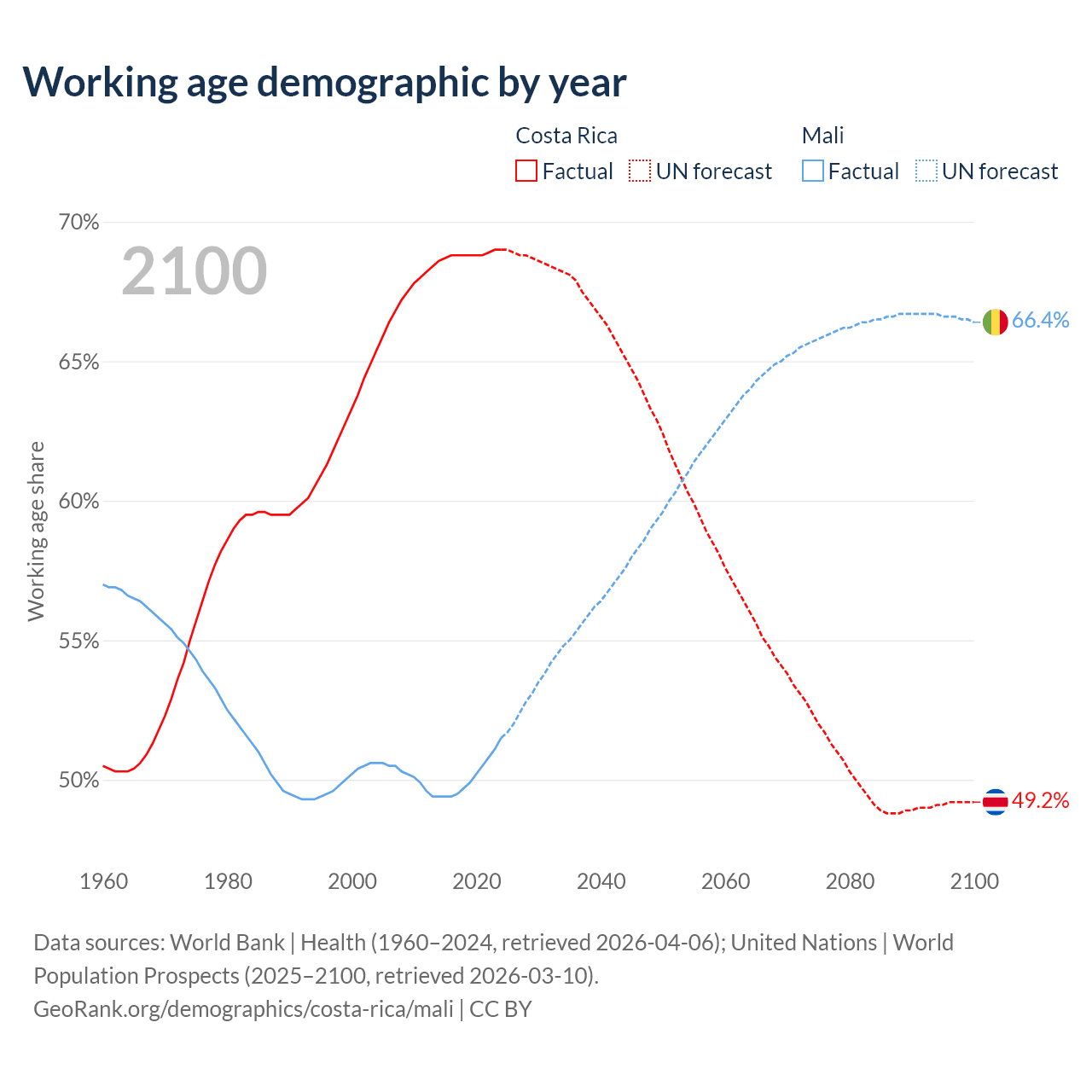 - Costa Rica has 3.57M working age adults (aged 15-64) vs 13.5M in Mali.