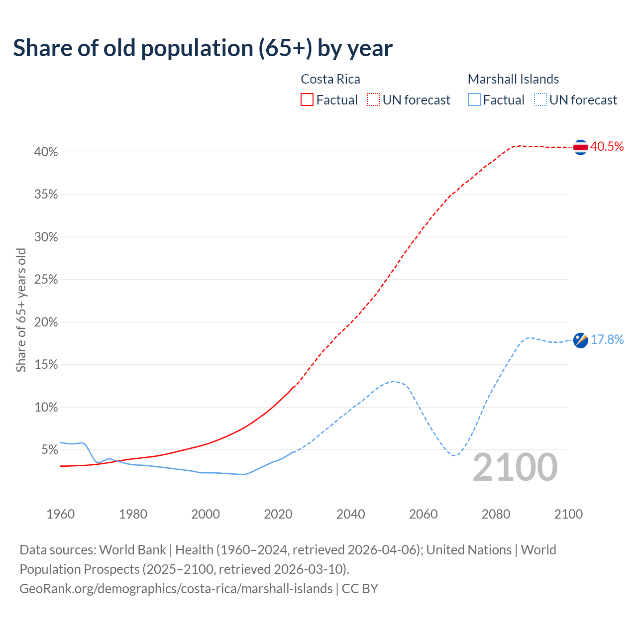 - The share of old-age demographic (65+) in Costa Rica is 12.2% vs 4.64% in the Marshall Islands.