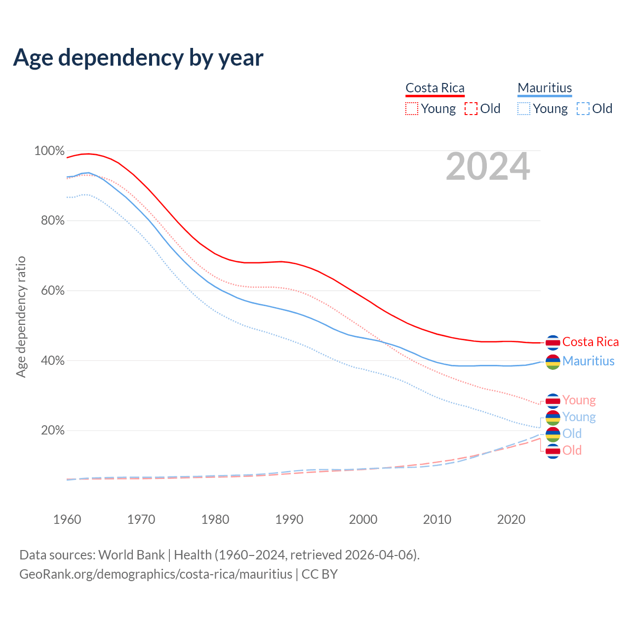 Data sources: World Bank | Health (1960–2024, retrieved 2026-04-06); U.S. Census Bureau (1960–2024, retrieved 2026-02-08).