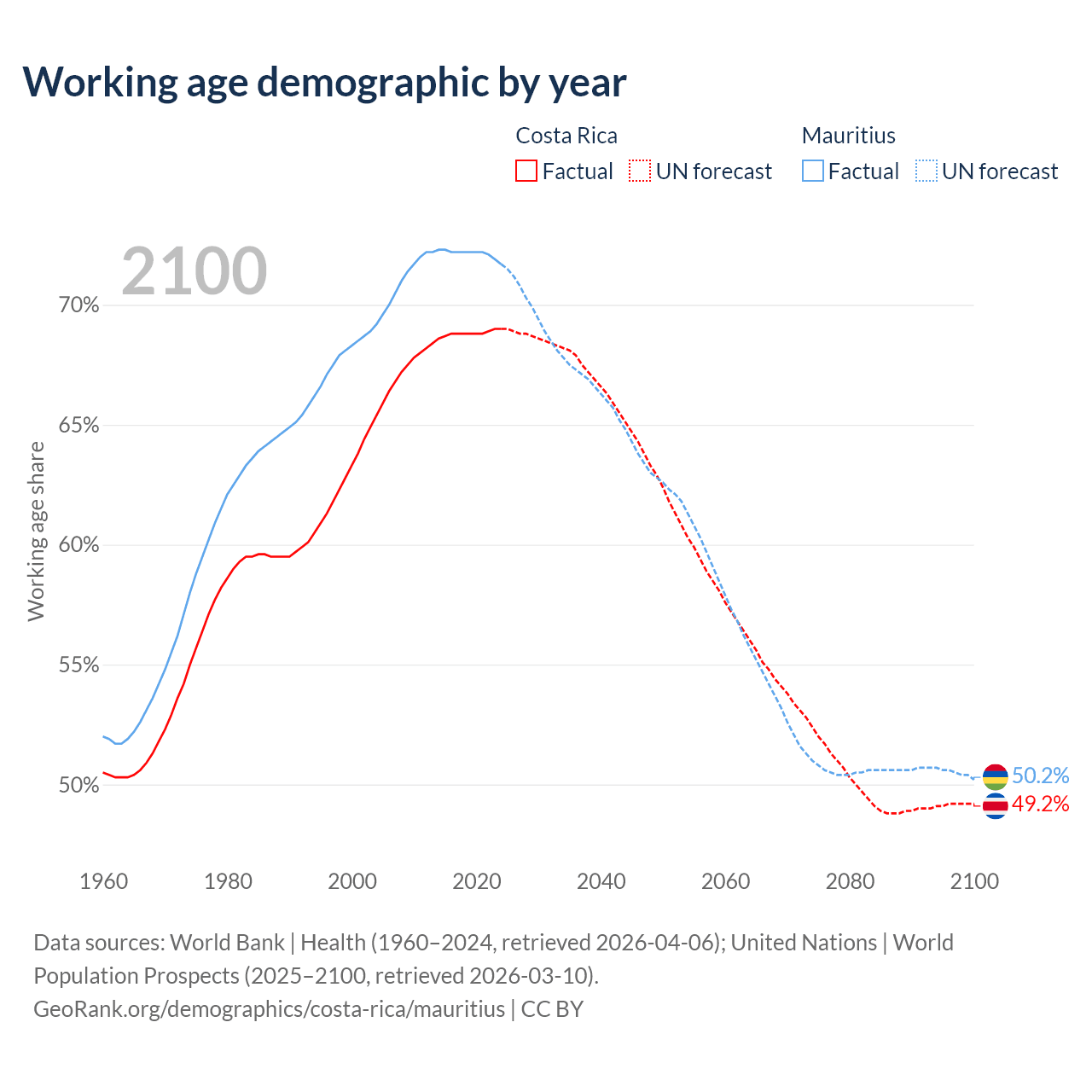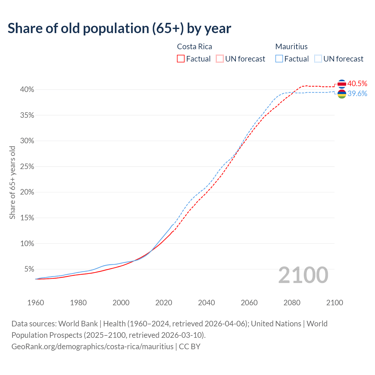 The share of older people aged 65 and over is 12.2% in Costa Rica and 13.5% in Mauritius. Life expectancy in Costa Rica compared to Mauritius .