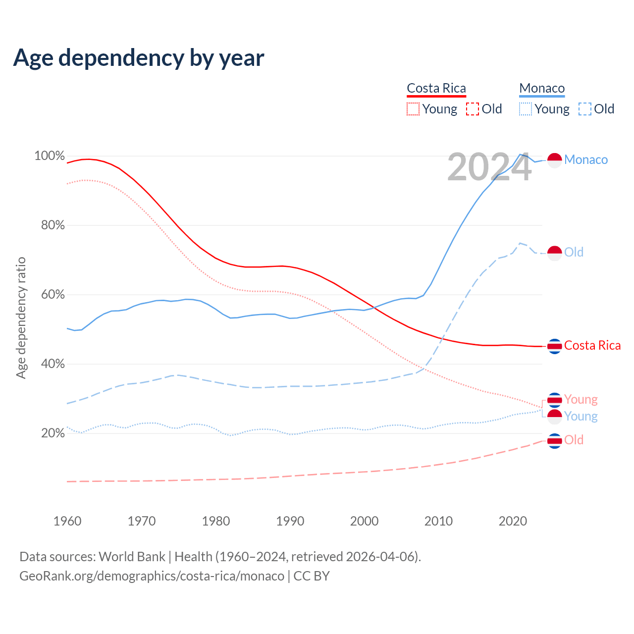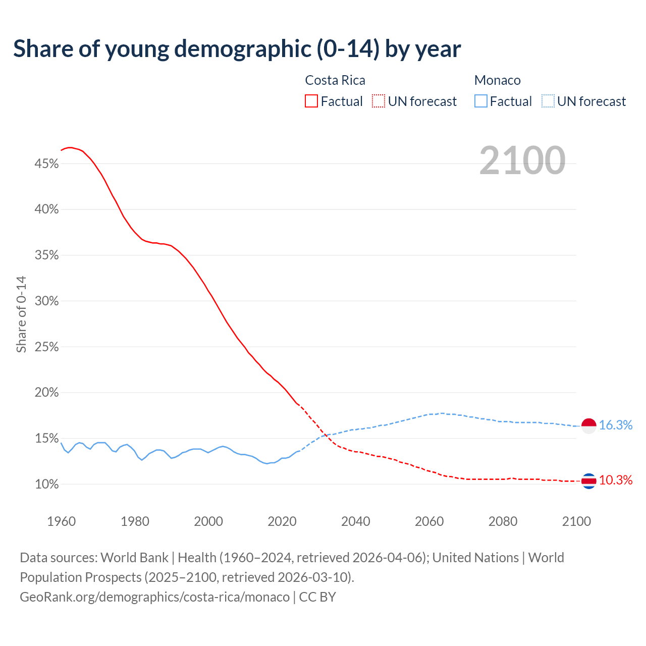 - The share of young demographic (0-15 years old) in Costa Rica is 18.8% vs 13.5% in Monaco.