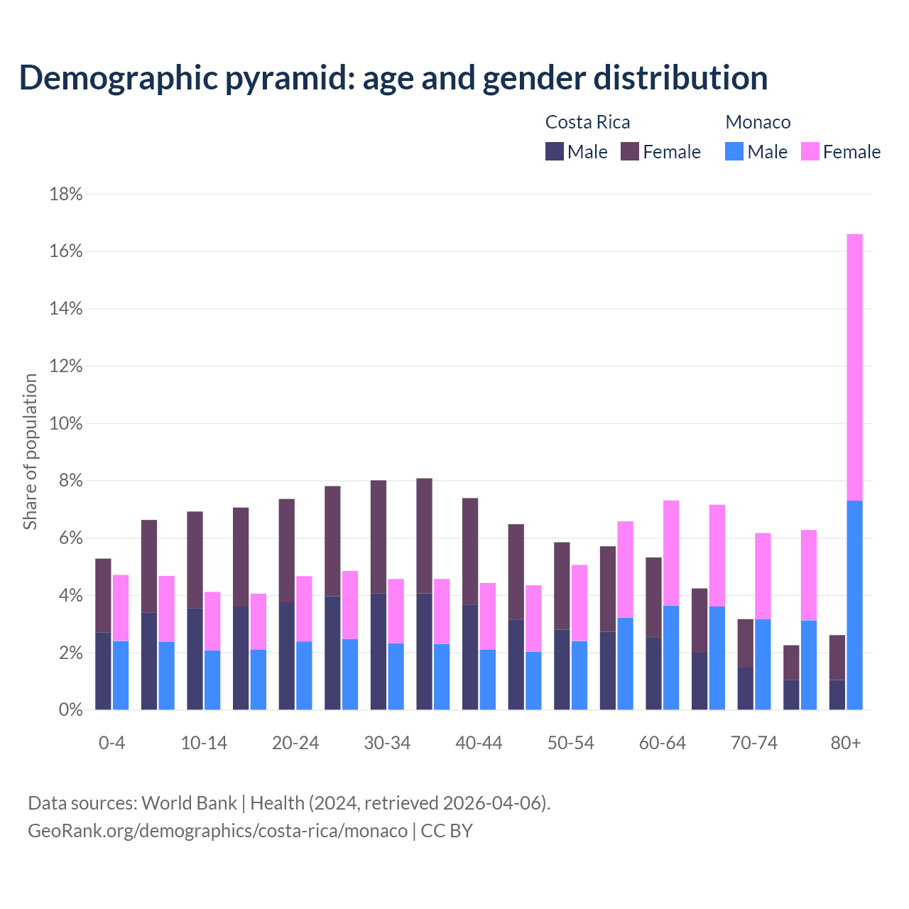 The share of older people aged 65 and over is 12.2% in Costa Rica and 36.2% in Monaco. Life expectancy in Costa Rica compared to Monaco .