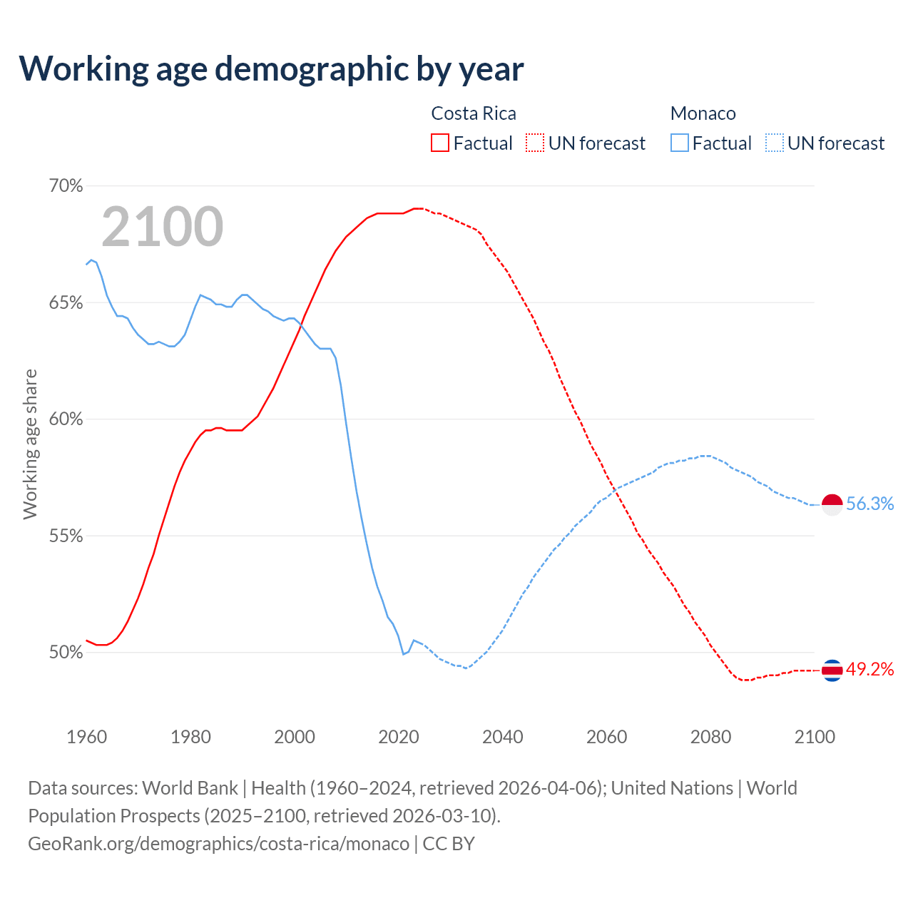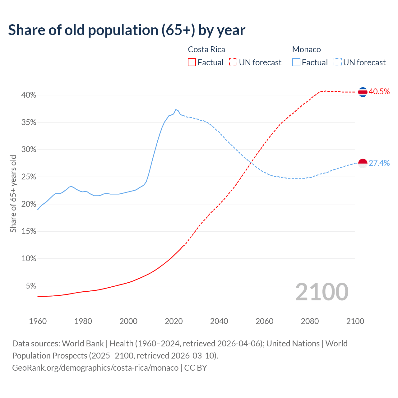 Median age Costa Rica vs Monaco, 1960-2100