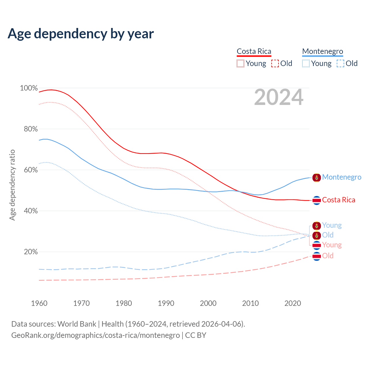 Data sources: World Bank | Health (1960–2024, retrieved 2026-04-06); U.S. Census Bureau (1960–2024, retrieved 2026-02-08).