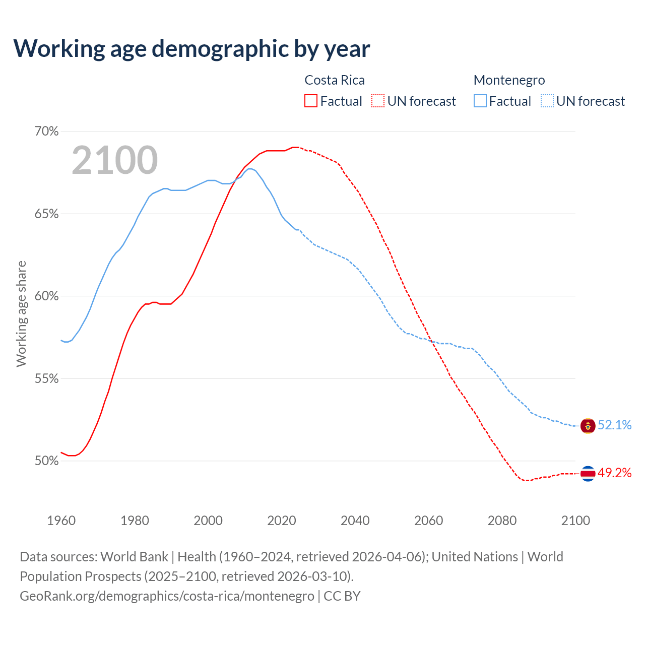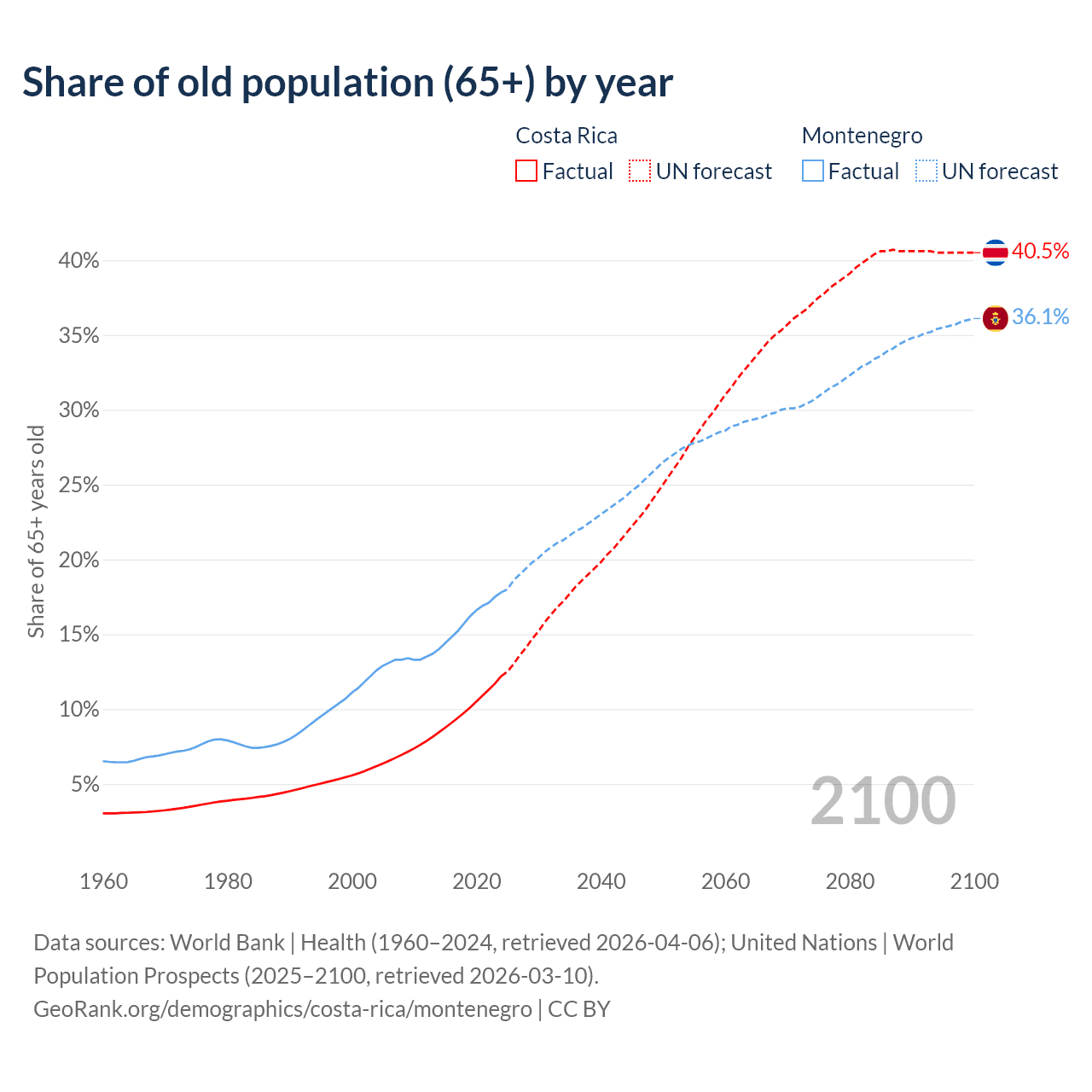Median age Costa Rica vs Montenegro, 1960-2100