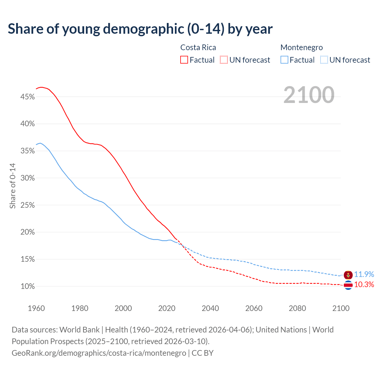 - The share of young demographic (0-15 years old) in Costa Rica is 18.8% vs 18.1% in Montenegro.
