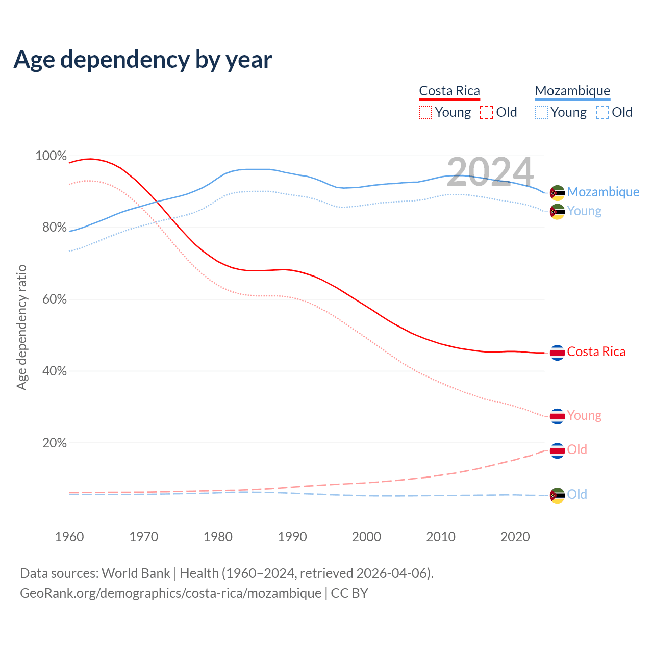 Data sources: World Bank | Health (1960–2024, retrieved 2026-04-06); U.S. Census Bureau (1960–2024, retrieved 2026-02-08).