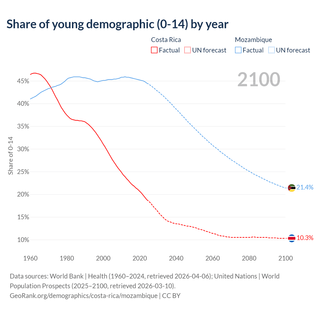 - The share of young demographic (0-15 years old) in Costa Rica is 18.8% vs 44.5% in Mozambique.