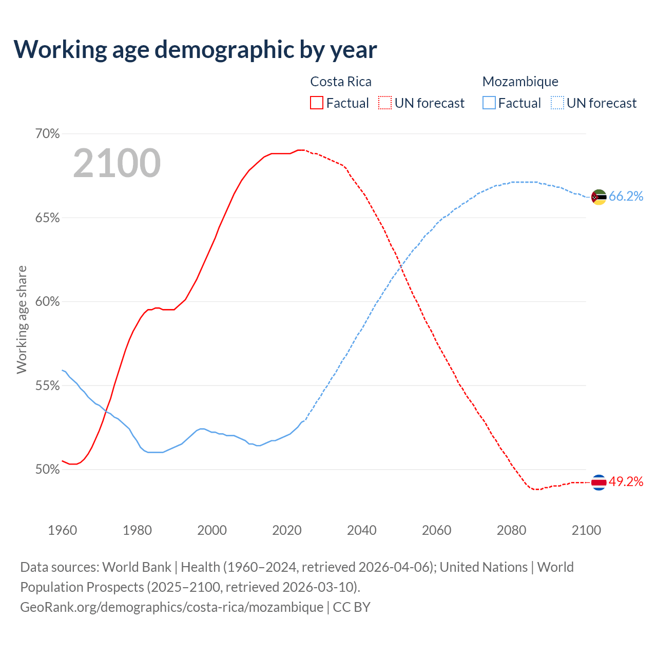 - Costa Rica has 3.57M working age adults (aged 15-64) vs 19.5M in Mozambique.